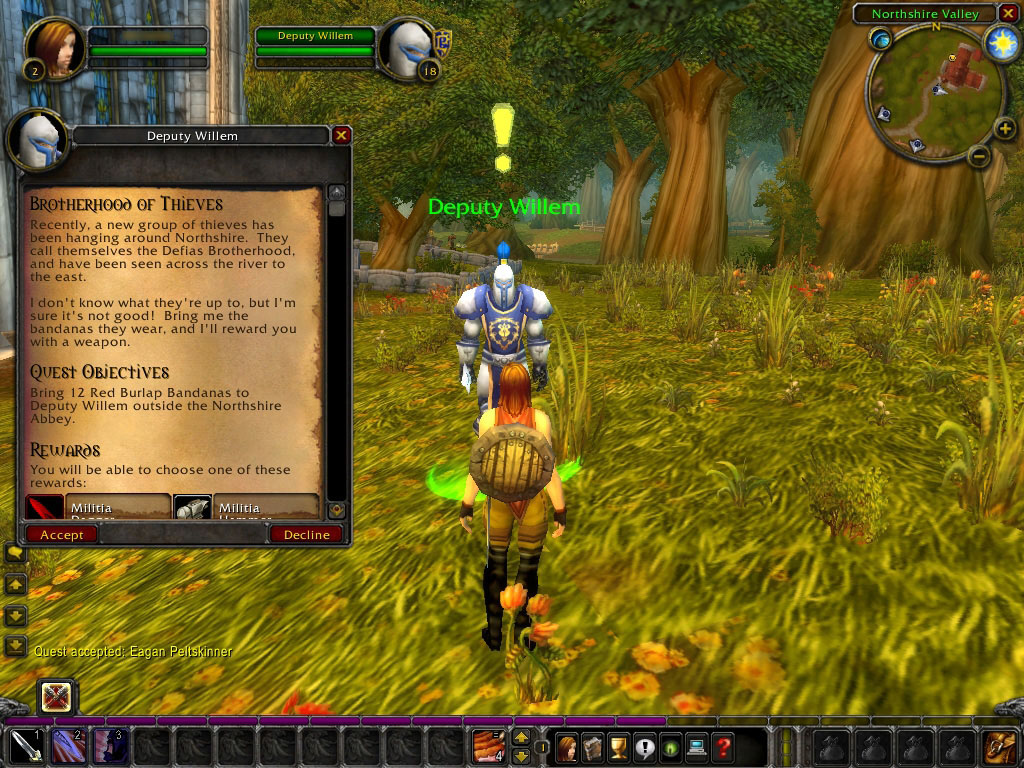 話しかけると,さらに二つのクエストが受けられた。「Eagan Peltskinner」はオオカミ退治をしてくれる人を探しているEaganに会えというクエスト,「Brotherhood of Thieves」は盗賊を退治して,その証拠として12枚のバンダナを持ってこいというクエストだ。後者はクリア報酬として,武器がもらえるようだ。