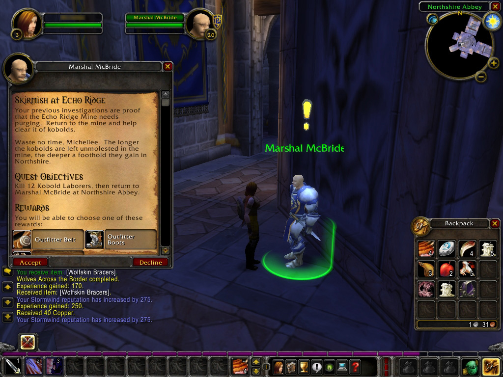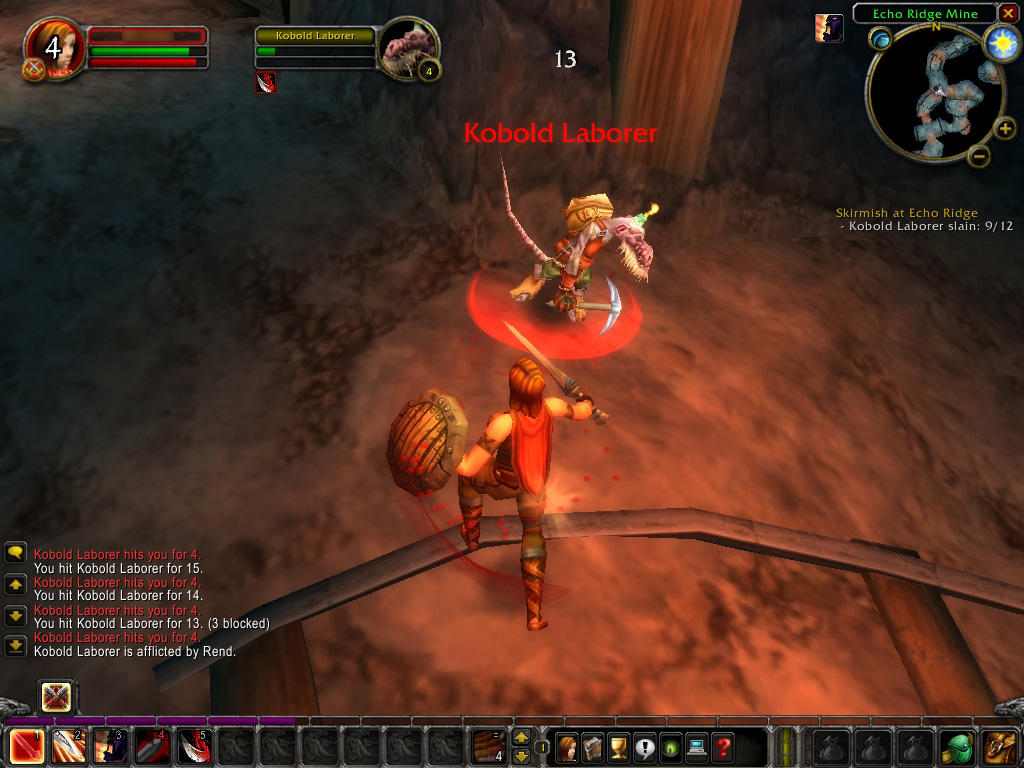 Kobold Worker退治のほうの報告に戻ると,お金と経験値がもらえて,さらに「Skirmish Echo Ridge」という,今度はKobold Laborerを12体倒してこいというクエストを受け取った。報酬は防具だ。
