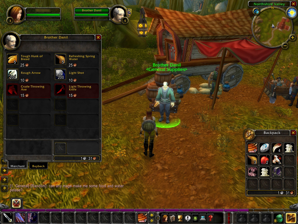 さて,このあたりでカバンに戦利品アイテムが溜まってきた。修道院を出てすぐのところにワゴンが止まっていて,その前に商人らしい人達が並んでいる。カーソルを重ねるとコイン袋の形になる人物が商人だ。右クリックでウインドウが開いたあと,Backpack内の売りたい品物を左クリックすると売却できる。誤って売ってしまったものは,しばらくの間は「Buyback」タブで売値で買い戻せる。
