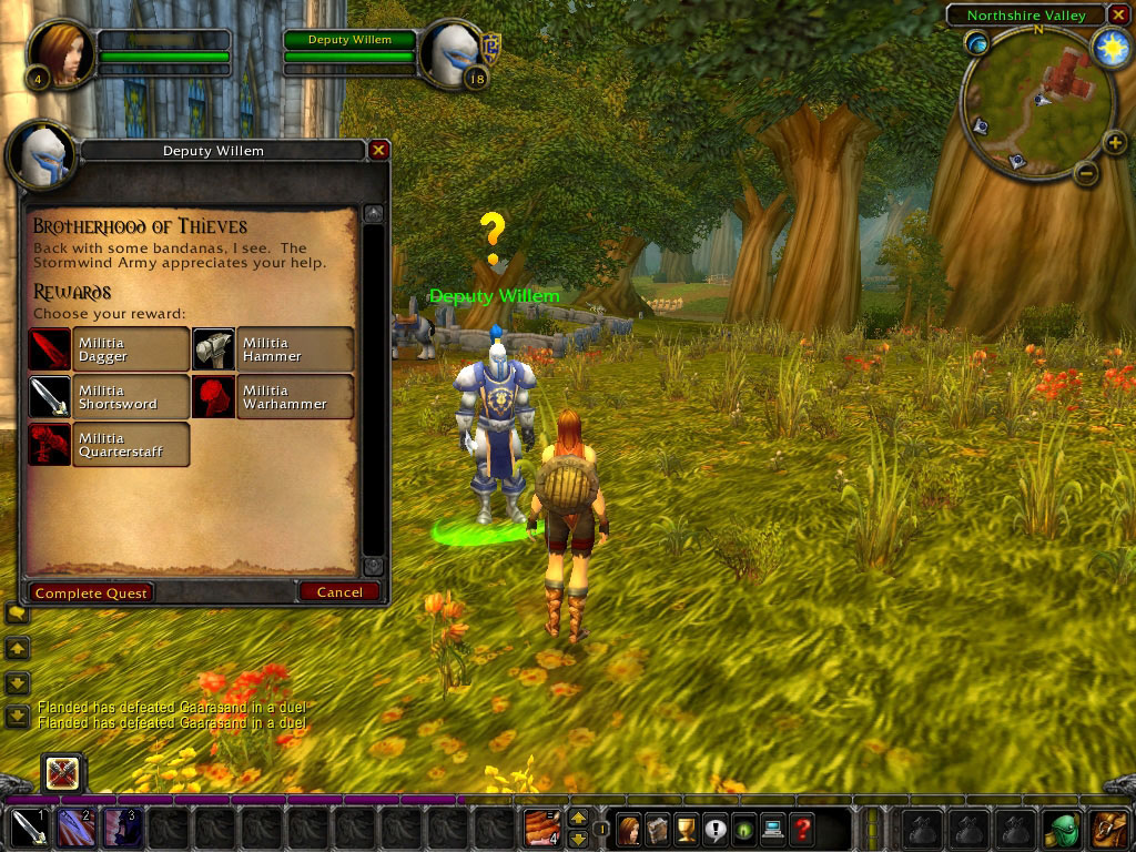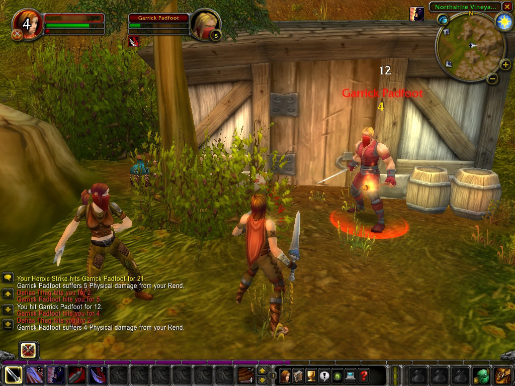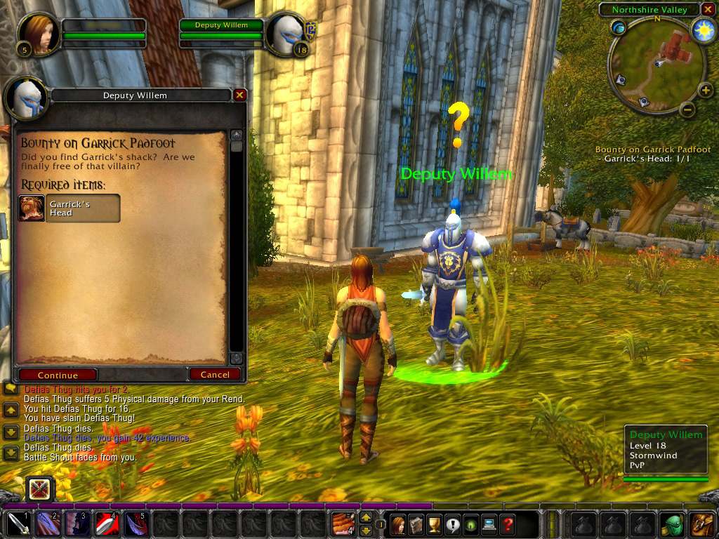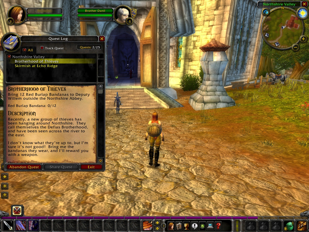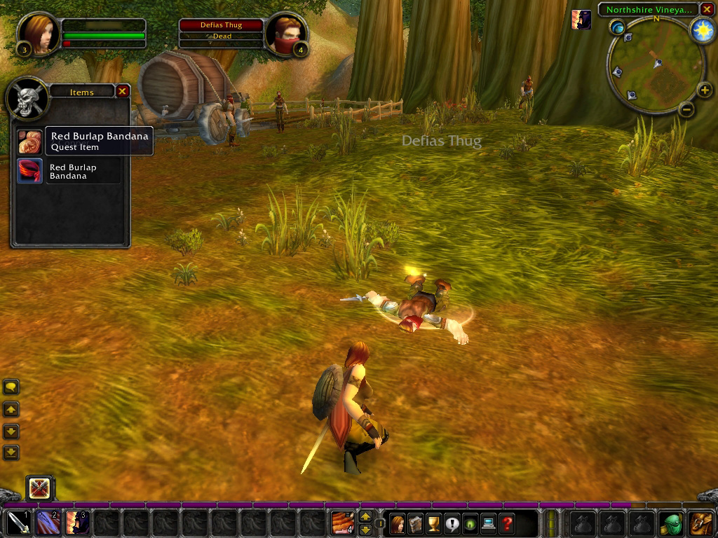 残るクエストは,Kobold Laborer退治と盗賊のリーダー退治だ。装備品も整ってきたことだし,まずは盗賊のボスに挑戦してみることに。Quest Logを読むと,農場の側に建っている小屋にいるらしい。襲ってくる盗賊を倒しつつあたりを捜索すると,奥のほうに小屋が見つかった。小屋の前にはリーダーのGarrickと,その部下らしきもう1体が立っている。1体ずつプルするのは無理なようなので,リーダーめがけて突撃。なんとか2体を打ち倒して,証拠としてリーダーの頭を拾い上げ,修道院前の兵士のところに報告に戻る。報酬としてチュニックを入手した。