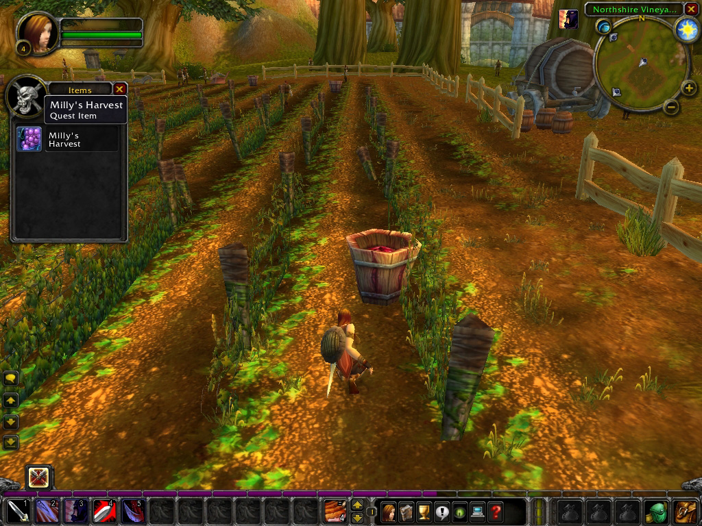 Quest Logに書いてあるとおり,Millyさんは修道院の裏手にいた。話しかけると一旦クエストクリアになったあと,次の「Milly's Harvest」というクエストが発動。盗賊が歩き回っている農場に置いてあるバスケットの中から,収穫済みのブドウを八つ取ってきてほしいという内容だ。引き受けて,先ほどの農場へと向かう。