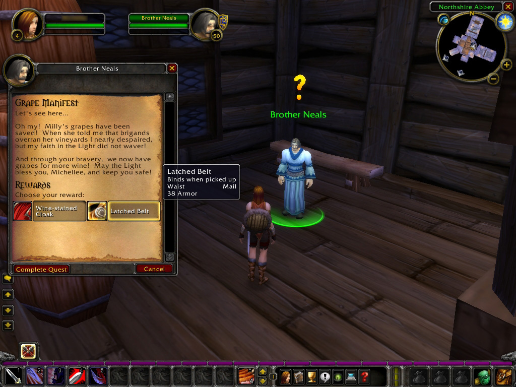 Millyさんのところに戻るとクエスト完了になり,次はグレープの目録を修道院の中にいる人物まで持っていくというクエスト「Grape Manifest」を渡された。報酬としては防具が入手できるようだ。Mini Mapの黄色いドットを頼りに探すと,目的の人物は修道院の上の階にいた。報告して,目録を渡す。報酬はベルトを選択した。このクエストクリアの経験値によってレベルは5になった。