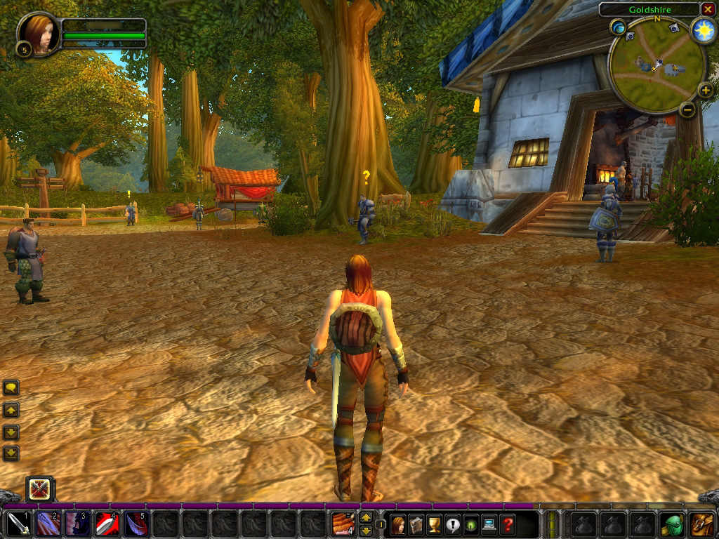 森の中を道沿いに南下すると,すぐにGoldshireの村に着いた。ざっと見回すと「!」や「?」を頭上に浮かべたNPCが何人かいる。これからしばらくは,この村を拠点として冒険することになりそうだ……。