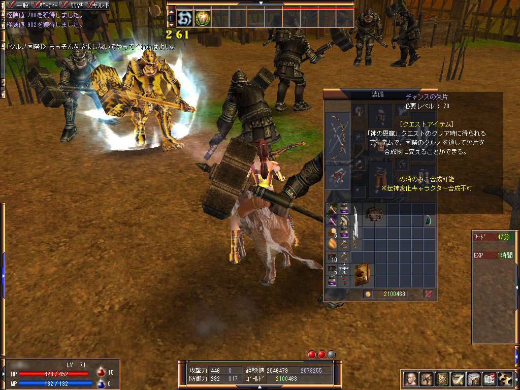 ただまぁ,このクエストはクリアも重要だが,入る経験値の多さが最大の魅力だ。1〜2発程度で倒せるようなザコモンスターとはいえ,その経験値は実に多く,またドロップするアイテムも質が良く,レベル100台の装備まで出るのである。
