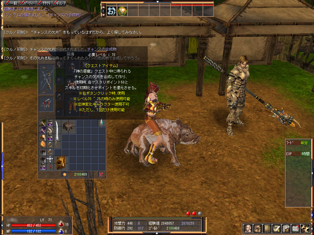 このクエストは,中に入ってボスモンスター扱いのナイントロルLを倒し,「チャンスの欠片」を手に入れることが目的だ。チャンスの欠片をクルノ司祭へ渡すと,報酬として「チャンスの合成物」が得られる。これは,スキルポイントをリセットし,またスキルマスタリポイントを50ポイント還元してくれるというもので,スキルを取り直したい場合に便利である。ただし,1回だけ使用できる,緊急アイテムとなっている。