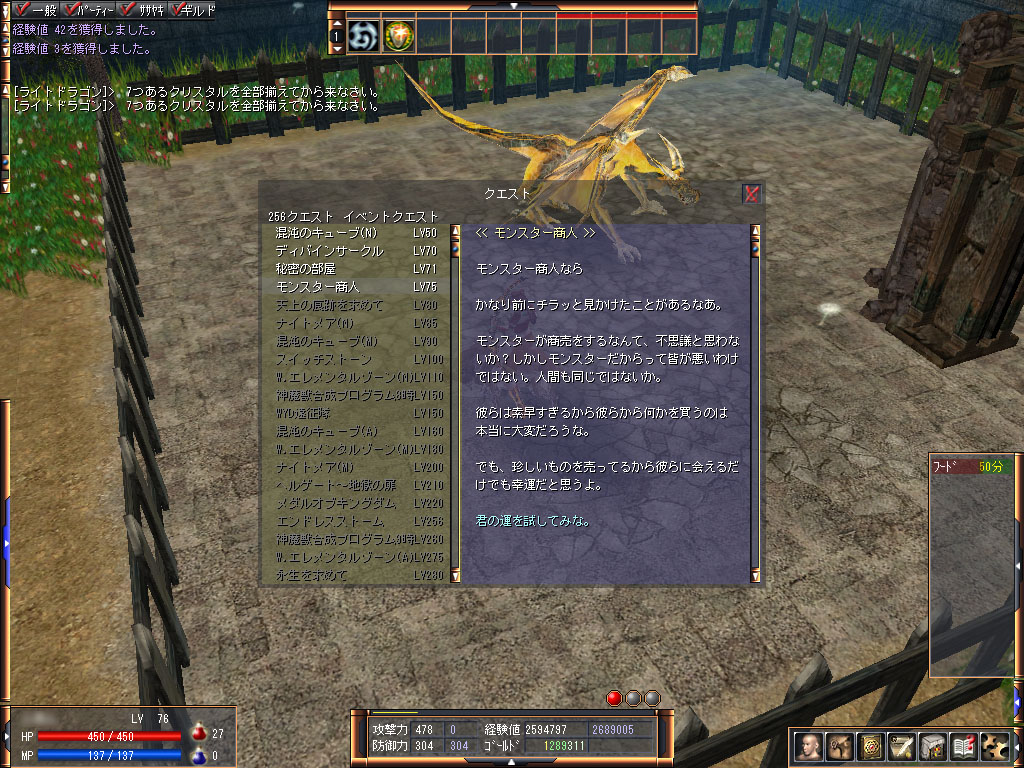 イベントクエストのレベル75で登場するのが,このモンスター商人。アルミアのライトドラゴンに話しかけると「7つのクリスタル」を持ってこいと言うが,それはこのクエストのことである