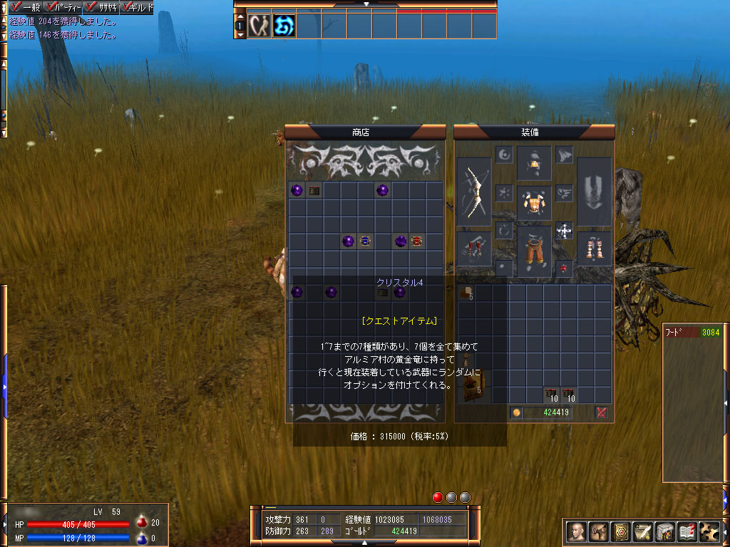 これらフィールド上の商人は,HPやMPを回復するポーションのほかに,アルミアのライトドラゴンが話していた,「7つのクリスタル」というクエストアイテムを販売している。これは,レベル75になると自動的に発動するクエスト「モンスター商人」に必要なアイテムで,このクエストの報酬は,装備している武器に,ランダムで何かしらの効果を追加してくれるというもの。運が良ければ,かなりの効果が付与される可能性もあるので,必ずクリアしておくべきだろう。