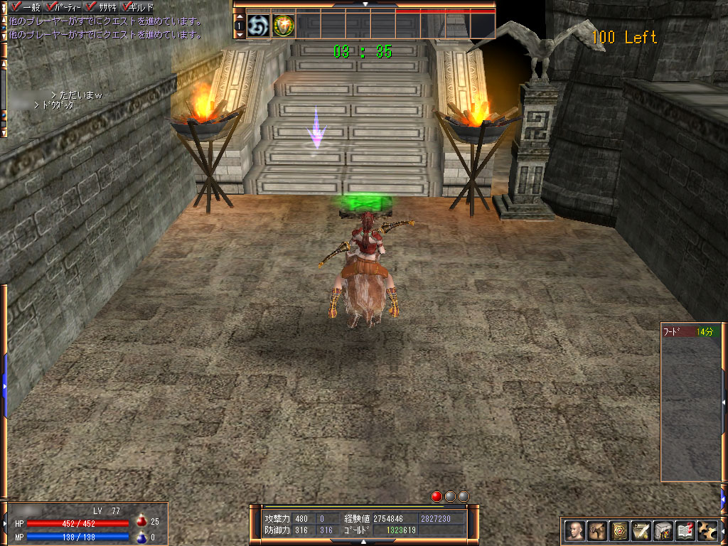 祭壇で挑戦状を使用すると,専用の部屋へとテレポートされる。入るのは一人でもパーティでも構わないが,短期間で多くのモンスターを倒さねばならないので,やはりパーティで行くほうがいいだろう。