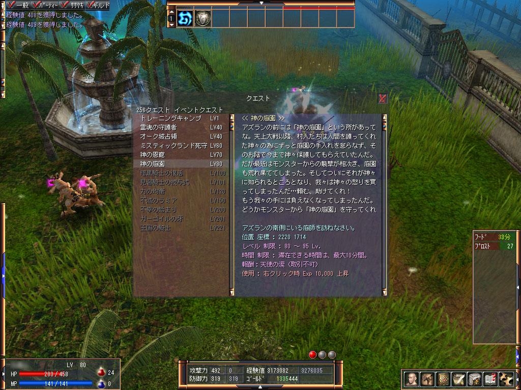 アズランから南へ出てまっすぐ行くと,魔角獣王が多く固まっている,柵に囲われたエリアがある。その中心にある壁に囲まれた場所が「神の庭園」である。レベル80〜95で南側の庭師に話しかけると中に入れる