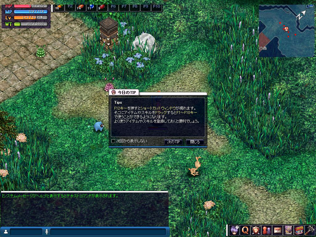 初心者向けのチュートリアルクエストなどはとくに用意されていないものの,新規キャラクター作成時に出会うNPC「インフォさん」が,基本操作についてはほとんど答えてくれるし,ログイン時に毎回表示される「今日のTIP」で,ショートカットキーの使い方,クエストの受け方などを教えてくれるので安心だ。また,公式サイトにはゲームの序盤のプレイを解説している「はじめての冒険」ページもあるので,参考にしてみるとよいだろう。