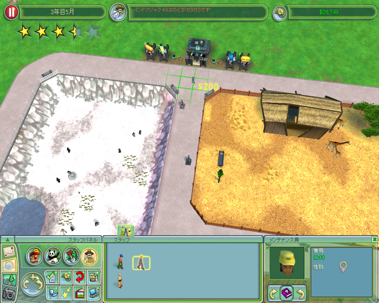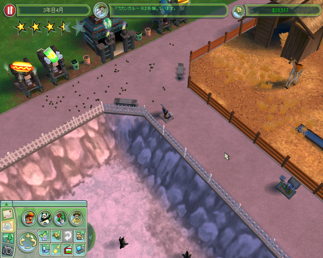 巨大サバンナを作るために園内のレイアウト変更を行いましたが,おかげで資金も半分くらいになってしまいました。いくら園の運営が堅調とはいえ,ここまで大きな改革をするとお客様もとまどってしまうことでしょう。新規に購入したダチョウとトムソンガゼルはお客様の肥えた目を楽しませるにはいささかキャラクターが弱いですから,ここらでなにかお客様の目を楽しませられる動物を購入してみたいものです。