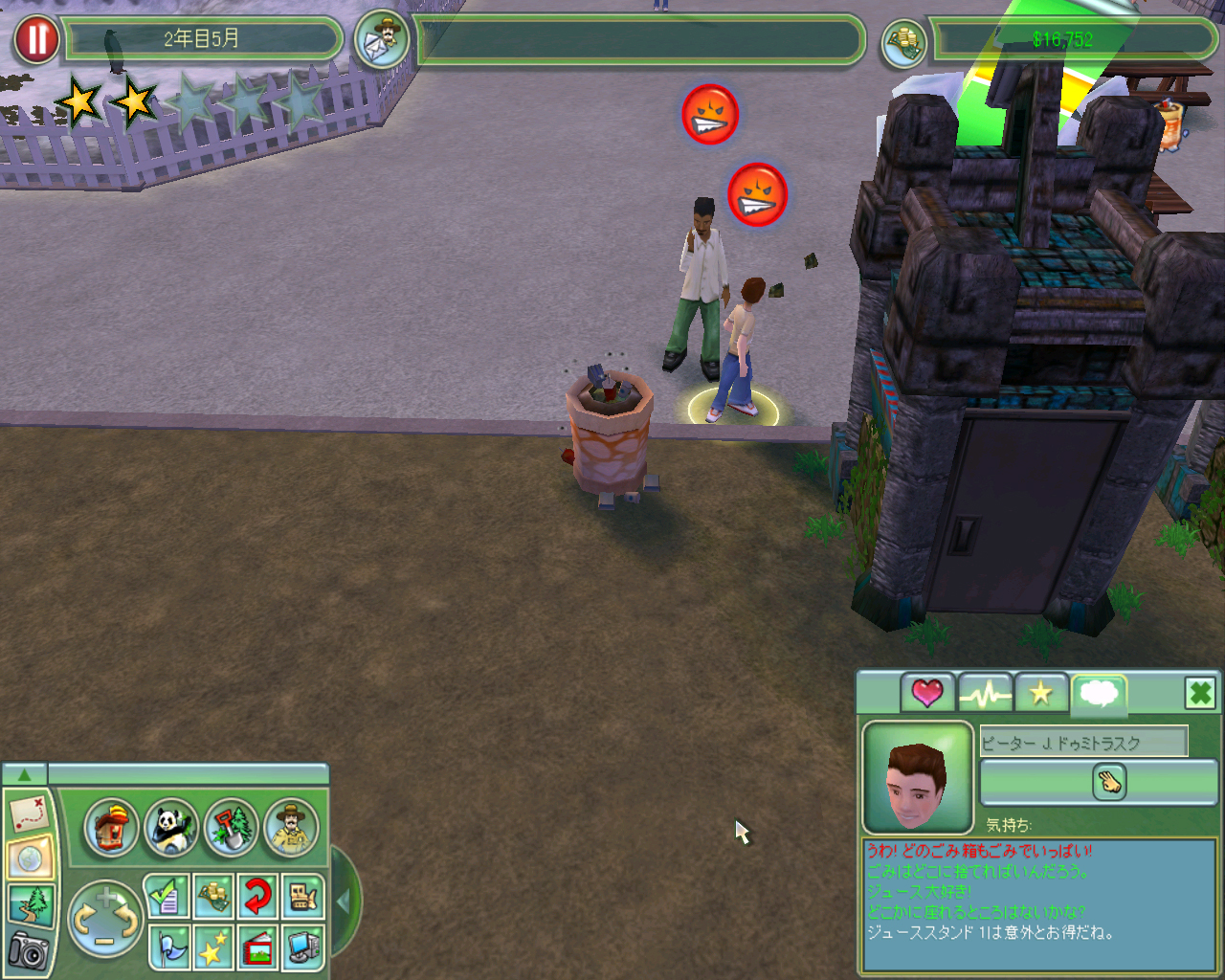 しかし,どんなにほかのスペースがカンペキな状態でも,園内の一部にメンテナンスの悪い部分があるとモロに客足に影響してしまうとは,なかなか侮れないゲームですね,コレは。
