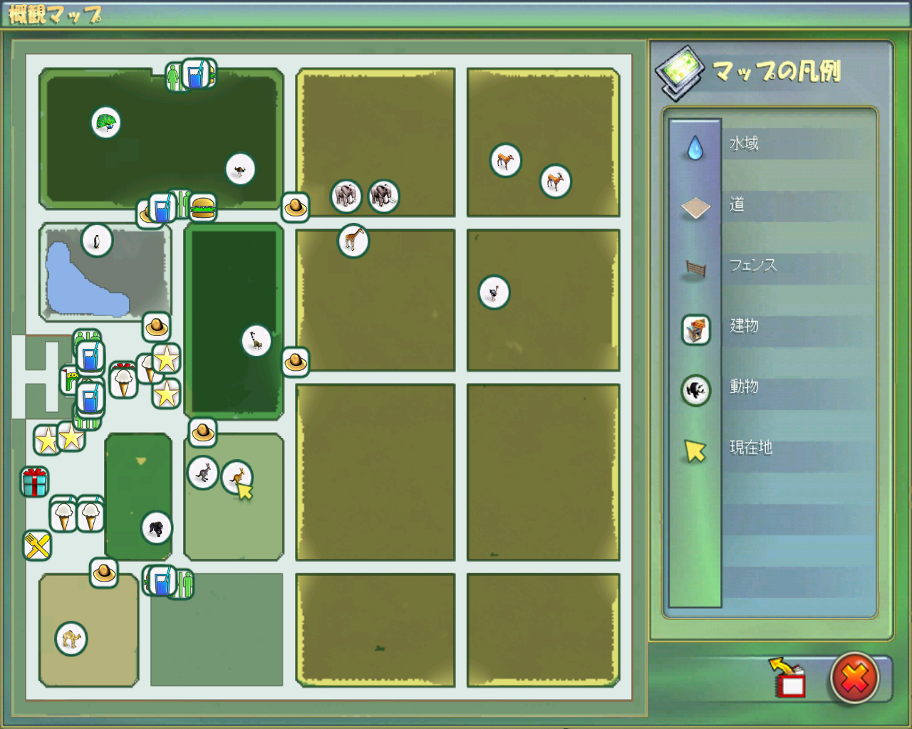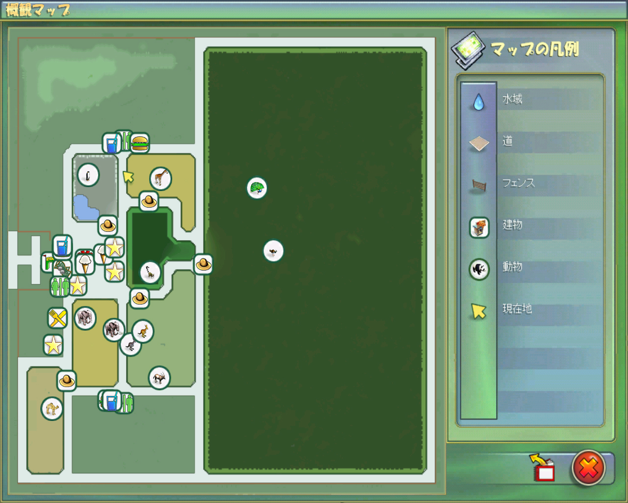 | そして現在のレイアウトです。マウンテンゴリラの施設ができたほかにも遊戯スペースなど拡張しています | マウンテンゴリラを購入したことで,本当に運営資金はすってんてんになってしまいました。連載第1回の最後に感じた以上の不安が胸のなかを去来します。はたして今回は大バクチを乗り越えられるのでしょうか? | |