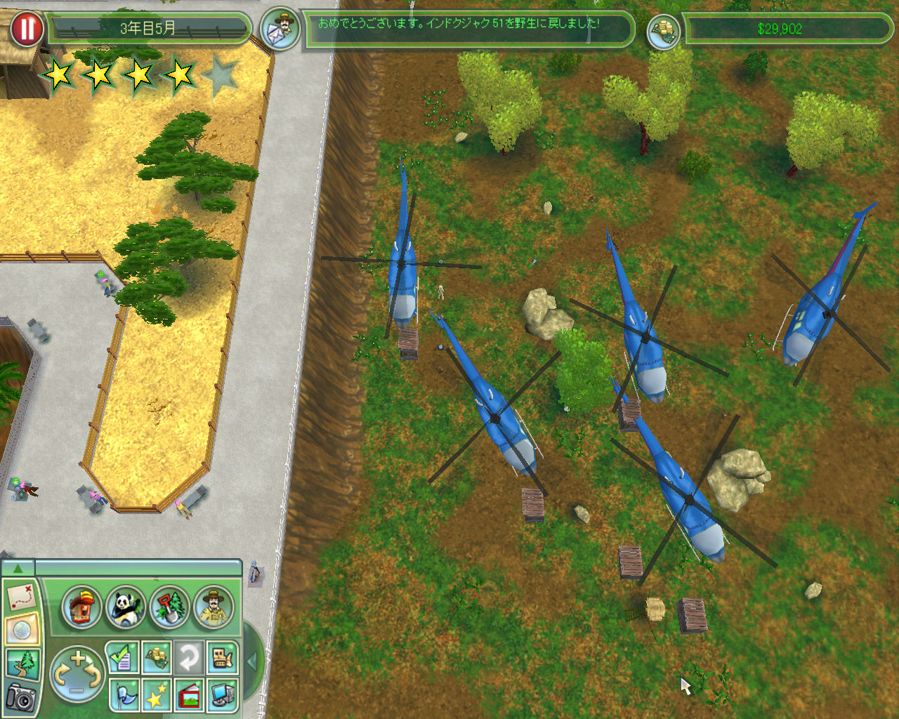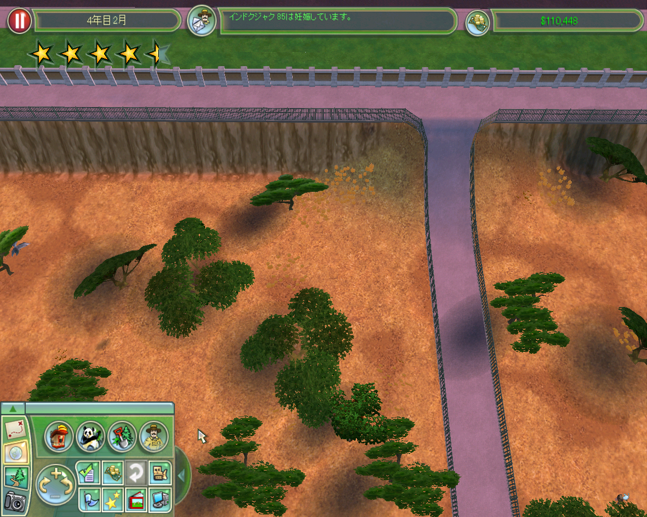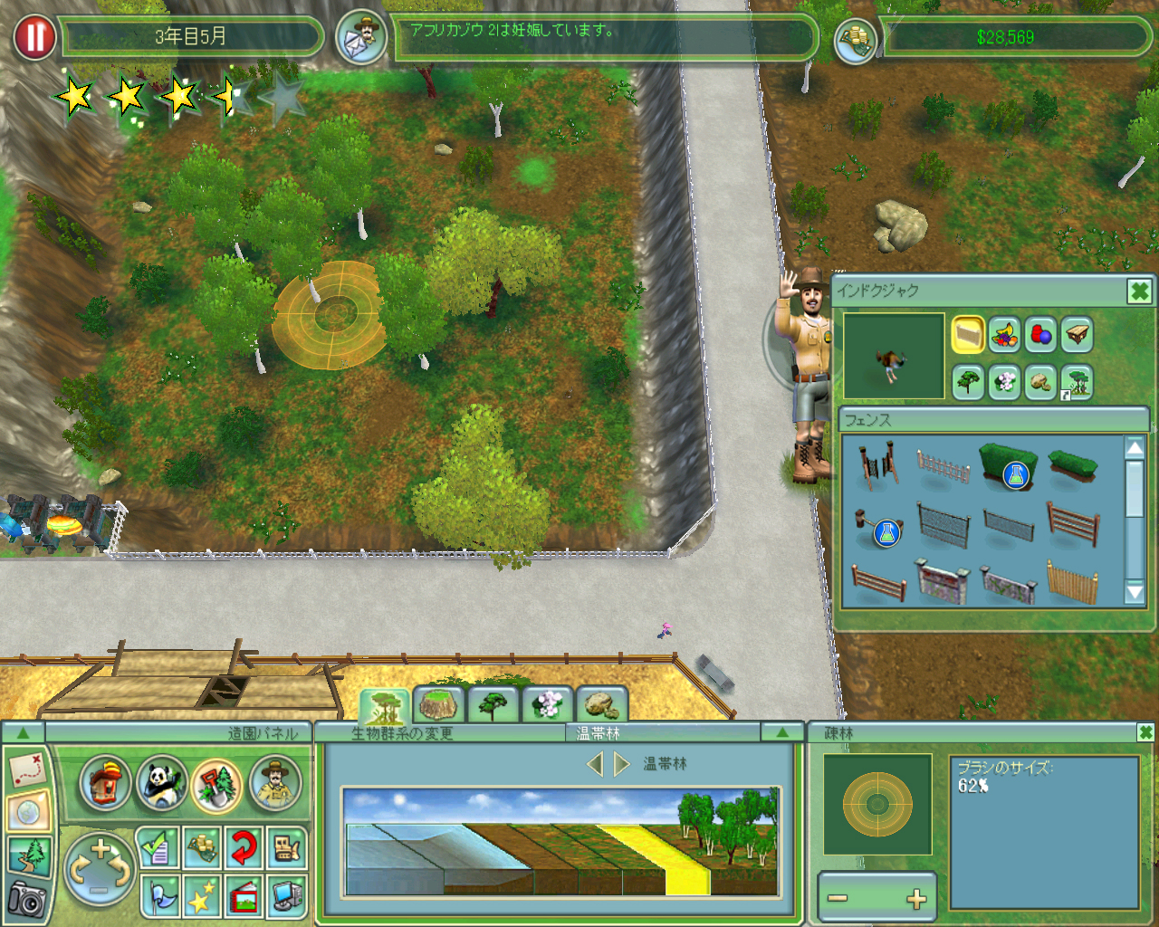 前回までに触れたように,ワタクシには「園内をサファリパークのようなモノにしたい」という野望があります。その一環として園東部に広がる空き地を巨大なインドクジャク園にするところまでは着手しました。園のメンテナンスを行い,また動物の飼育にマジメに励んだこともあって,どうやら園の運営資金も$10万を超えるくらい貯まりました。これだけあれば大幅なレイアウト変更にもなんとか耐えられそうです。そこでワタクシは巨大インドクジャク園にメスを入れ,そこを巨大サバンナにすることにしました!