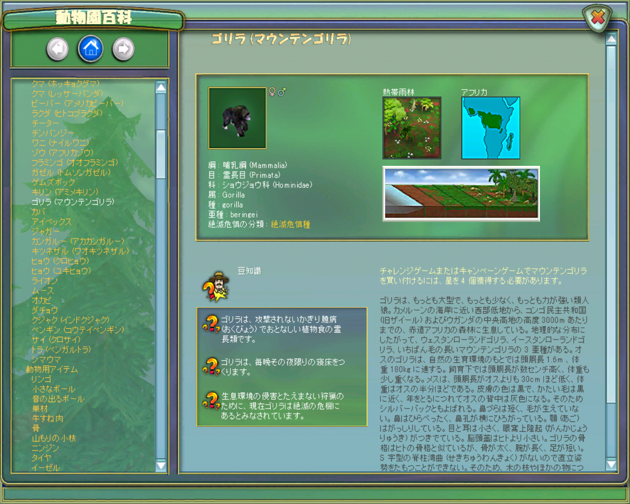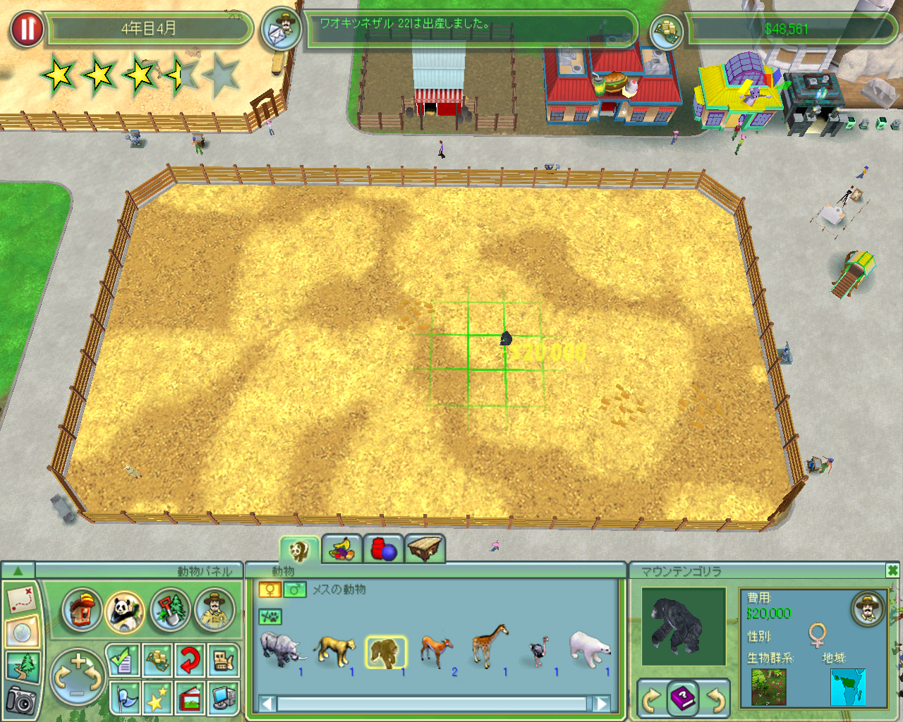 そう考えて購入可能な動物を眺めてみると,一体$20,000もする「マウンテンゴリラ」が購入できることが判明。大改革で運営資金が$50,000くらいに減ってしまった当園にとって,つがいの購入で$40,000の出費になるマウンテンゴリラは,魅力的である以上にリスクの大きな動物といえそうです。しかし,これまで運営が厳しくなったときは新しい動物を購入することで経営を持ち直してきたワタクシは,あえてハイリスク・ハイリターンの道を選んでみることにしました。