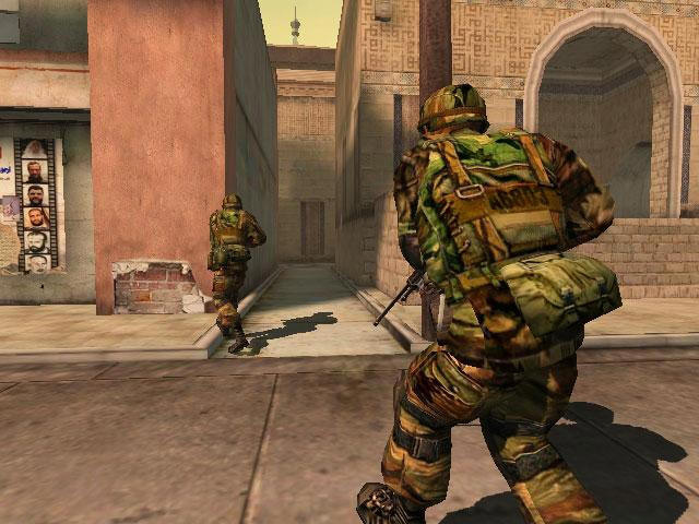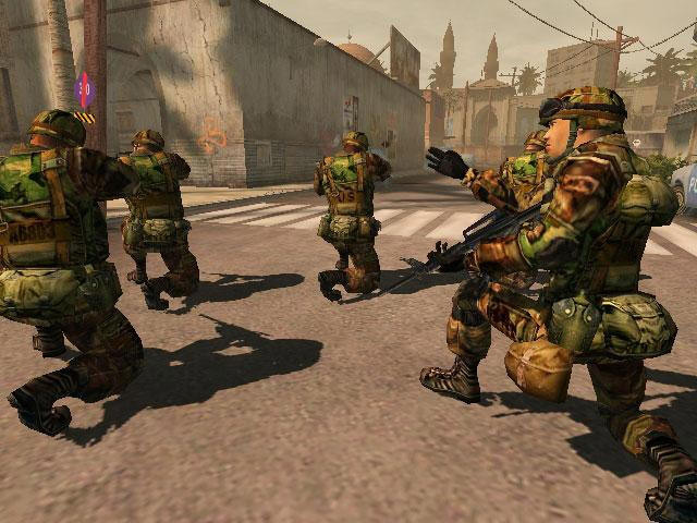 いつ攻撃を行うべきか,自分のキャラクターが有効なポジションにいるかどうかが一目で分かるシステムなのだが,そのぶんアクションゲームとしての緊迫感は削がれ,戦術的な思考に集中できるようになっている。もっとも,多くのオブジェクトはHavocエンジンで被弾やグレネードの爆発による破壊がシミュレートされ,油断していると隠れる場所がなくなってしまう。ビルの壁も少しずつ崩れていくし,カバーできるオブジェクトには道に横たわっている牛の死骸などもある。 Full Spectrum Warriorにはミニマップが存在せず,2チームのリーダーからカメラをズームアウトさせて近辺の俯瞰図が確認できるだけだ。これも,リーダーとして周辺の地形を迅速に頭に叩き込むことの必要性からきているのだという。アルファチームは,突撃を専門として軽量の兵器を装備しており,ブラボーチームはサポート部隊としてグレネードランチャーやサブマシンガンを携帯している。 チームワークは,Full Spectrum Warriorの重要なポイントになっている。ブラボーチームのライフルマンが保持している武器は,軍ではSAW(Squad