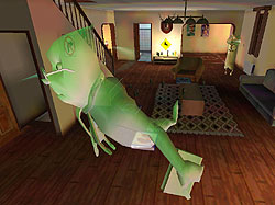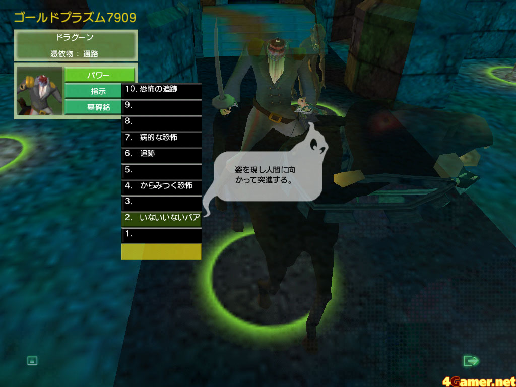 先述したように,プレイヤーの目的は,ゴースト委員会から与えられた任務を手下のゴーストたちを使って遂行することだ。 任務はすべてで14種類あり,ゲームの進行に合わせて,選べるものが増えていく。 遂行する任務を選ぶと,まずその内容がムービーで表示される。任務によって連れていけるゴーストの数が決められているので,プレイヤーはその任務に合わせて,手下のゴーストたちの中からどいつを連れていくかを決めるのだ。 とはいえ,プレイヤーは新人のゴーストマスター。その任務にどのゴーストが向いているのか,慣れるまではよく分からないだろう。しかしご安心を。自動的にゴースト委員会お勧めのチーム編成になる「おまかせ」コマンドも用意されている。 で,ゲームスタート。スタート直後には,クリア条件が表示される。この条件を満たすために,ゴーストたちをうまく操らなければならないわけ。 ゲームがスタートすると,プレイヤーが何もしていなくても,舞台となる建物の中では,人間たちが自由気ままに活動している。こいつらが,実にいい動きをするのである。ぐうぐう寝ているやつもいるし,異性との会話に盛り上がってるやつもいる。テレビを見ていたと思ったら,食べ物を取りに冷蔵庫に向かったり。 ちなみに本作は3Dグラフィックスで描かれているため,比較的自由な角度/距離で人間たちを観察できる。残念ながら極端なズームや視点を水平に近い角度にすることは不可能だが,その代わりに,カメラを指定した人間の視点に切り替え可能。ほかの人間たちの行動やゴーストたちの怪異を,自分の目で見たように確認できるのである。 このほか,特定の人物やゴーストを追いかけるようなカメラ視点も用意されている。こちらは重要人物を常に監視していたいときに便利だ。 さて,いくら面白いといっても,いつまでも人間たちを眺めていては,任務を達成できない。人間たちに,ゴーストたちの力を見せつけてやるのだ。 そのためには,まずゴーストたちを何かに"憑依"させなければならない。憑依できる場所はゴーストごとに違って,人間だったり,部屋だったり,電化製品だったりする。まぁゴーストを選択してメニューから「憑依」を選ぶと,そのゴーストが憑依できる場所が緑の枠で囲まれるので,どこに憑依させたらいいか分からない,なんて状況は少ないだろう。 ゲーム画面の上部には,ゴーストマスターが使用できる"プラズム"が,緑のバーで表示されている。ゴーストを何かに憑依させると,プラズムバーから,そのゴースト分の"プラズム"が分配される(引かれる)のだ。当然プラズムが足りなければ,ゴーストを憑依させられない。またこのプラズムは,ゴーストたちの特殊能力"パワー"を発動するにも必要だ。 そのため,多くのゴーストに同時に強力なパワーを使わせるためには,プラズムが大量に必要となる。しかし任務開始直後では,さほどプラズム量はない。では,どうするのか? なんと人間たちに恐怖を感じさせることで,プラズムの量が増えるのである。 つまり,どのような任務であれ,人間たちに怖がらせることが重要になってくる。ゴーストを何かに憑依させる→パワーを使って人間を驚かす→人間が恐怖を感じプラズムが増大→より多くのゴースト/よりレベルの高いパワーを使用可能に→より人間が恐怖を感じて,その分プラズムが増大→……といった感じである。