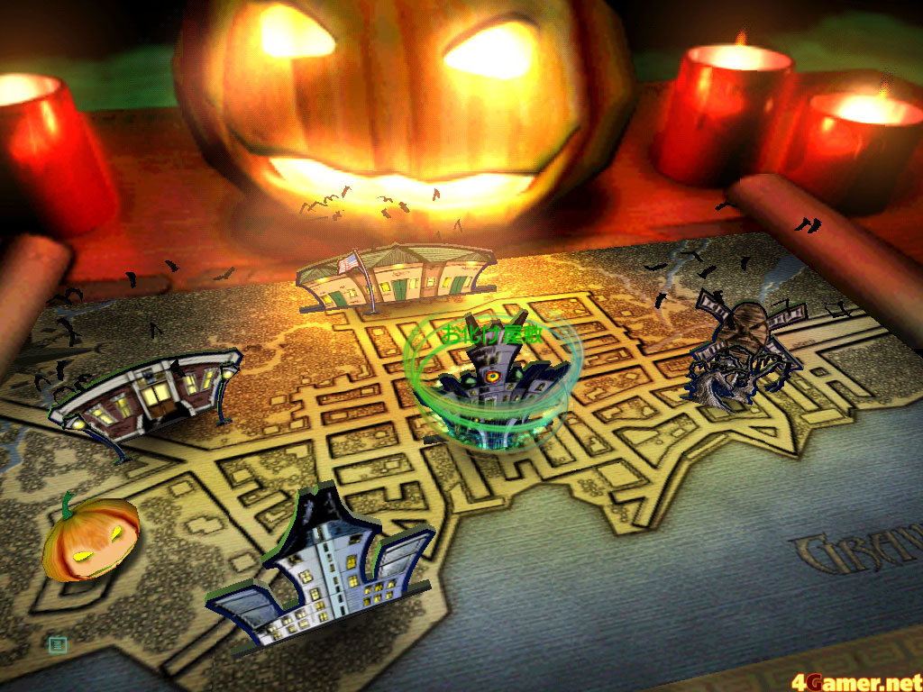 このゴーストマスターというのは,さまざまなゴーストを集めてチームを作り,このチームを操って,ゴースト委員会からの指令を達成していく人(いや,ゴースト)のこと。そう,ゴーストマスター自身も"死者"なのである。 ちなみにこのゴースト委員会の目的は,愚かな人間たちを始末する……なんて怖いことではない。それどころか,ゴーストたちは,人間の命を奪うことを禁じられているらしい(誰に禁じられているかは不明)。理由は,マニュアルにこう書いてある。「死とはいずれ訪れる不可避なものだから……」。結構フェアである。 では,委員会の目的は何か? それは,"楽しく人間を脅かすことにより,彼らに死者に対する畏敬の念を抱かせること"だとか。 新興宗教団体を装った詐欺師グループ並の目標だが,こっちは本物のゴーストたち。いうなれば,タレントの丹波哲郎氏や稲川淳二氏のような,"霊界の伝道師"なんだろう。たぶん。 ゲームを起動し,メニューから「新しいゲーム」を選択すると,オープニングムービーが始まる。最初に目に入るのは,星々がきらめく宇宙空間を,巨大なカボチャ頭と,頭からシーツをかぶったような"いかにも"なゴーストが走り抜けていくという,見る人すべての度肝を抜く映像だ。 続いて,やはり"いかにも"な巨大な西洋風の城が映し出される。雷鳴がとどろき,雰囲気はバッチリ。その城の中では,若い男女の一団が,好奇心から降霊会(どっちかというと「狐狗狸さん」かな?)を行っている。……と,その儀式に使っているアルファベットが並べられたプレートに画面がズームしていき,プレイヤーに対して名前を聞いてくる。ここで入力した名前が,新人ゴーストマスターの名前となるわけだ。 さて名前を入力すると,オープニングムービーの続きに。この城を舞台に,さまざまなゴーストたちが暴れ回る一大アトラクションが展開する。非常によくできたムービーなので,ぜひ多くの人に見て頂きたい。
