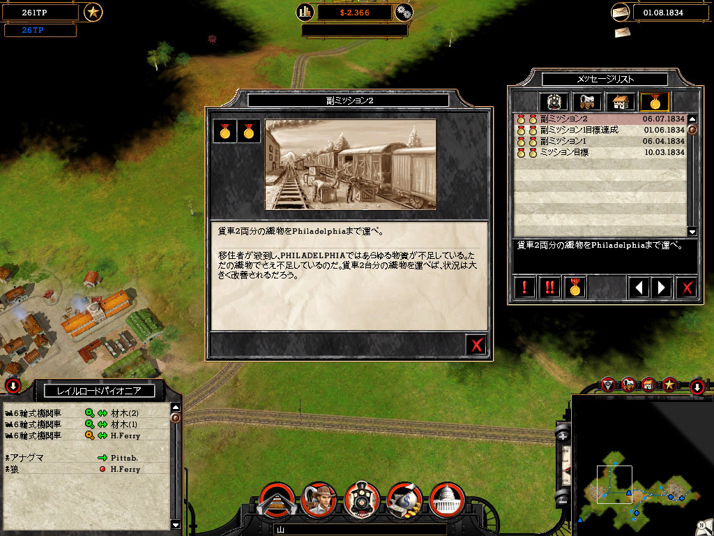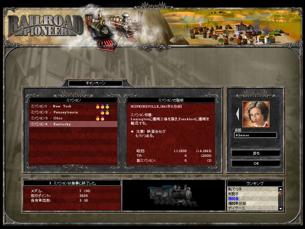 メインのキャンペーンモードでは,目標をクリアすると成果によりメダルが授与され,次のミッションに進める。ミッション目標は,"別の町と鉄道を接続しろ" "ライバル会社に通商戦争で勝て"などさまざまだ。また,ミッションの途中には副ミッション目標も発生する。これに挑戦するかどうかは自由だが,多くのメダルを獲得したければ達成させるべきだろう。一度クリアしたミッションは再挑戦可能で,バージョンアップさせた機関車を持ち込んで,より好条件で再挑戦すれば成果も上がるはずだ。