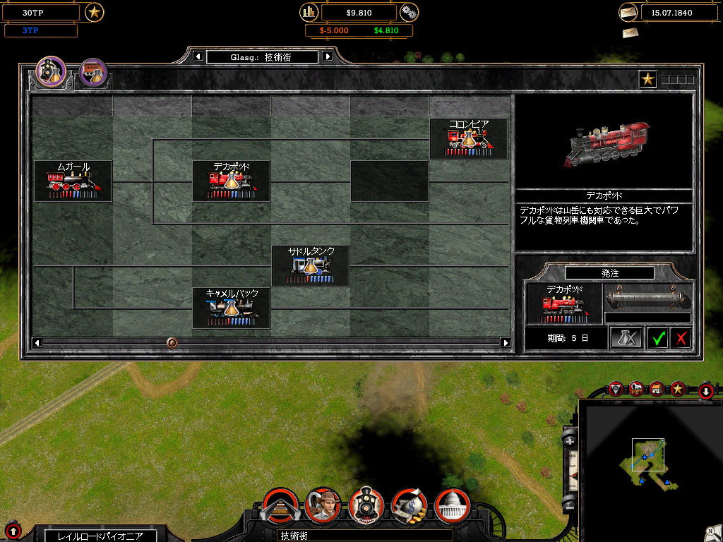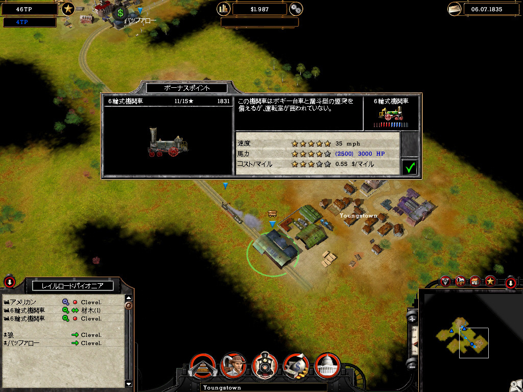| 画面周囲のアイコンをクリックすれば,さまざまな情報が表示される。列車の運行状況や開拓状況も把握しやすい | 列車視点で鉄道網を眺めるのも悪くない。博物館に飾ってあるような機関車が走り回り,歴史を感じさせてくれる | ミッションをクリアしていき,年代が進むと新しい機関車を開発できる。25種類の実在する機関車が登場する |