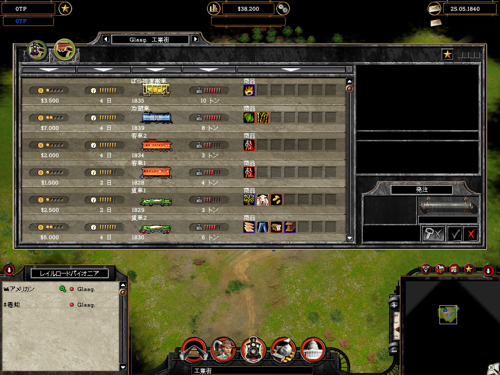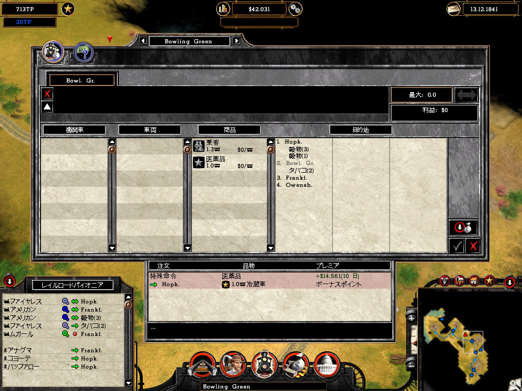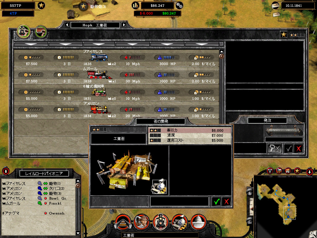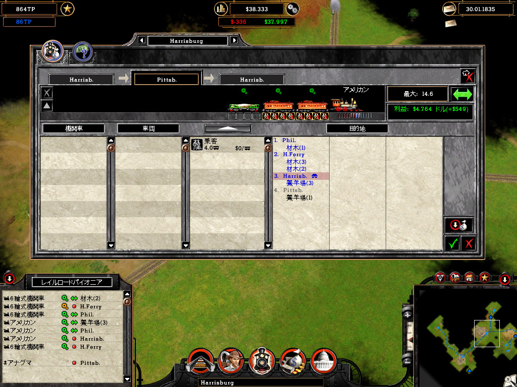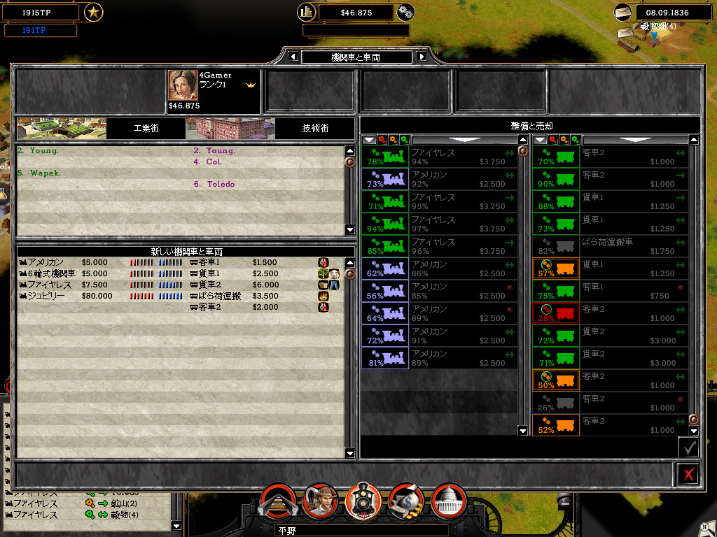 乗客を移動させて運賃を得る,商品売買により安く仕入れ高く売る,これが基本的な収入源だ。出発駅から終着駅まで一度の輸送を行う一般通商,同じルートを行き来させる恒久通商ルートがあり,駅で商品を仕入れて必要としている町で降ろすことで売買が成立する。必要のない商品を運んでも買い手が見つからず,赤字になってしまうわけだ。このへんの収支予想は前述した運行管理画面で把握できるので,実際に運行させるまで結果が分からないということはない。