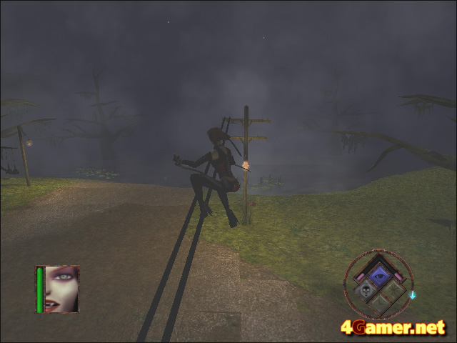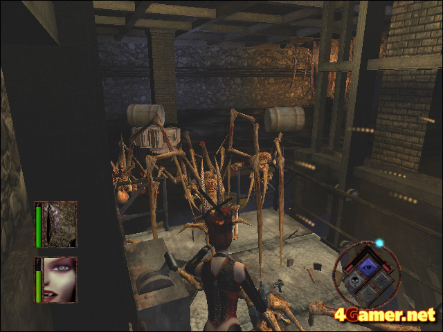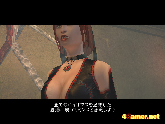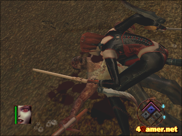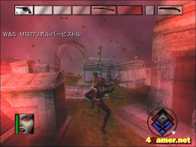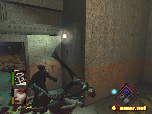 そして,ここからが本作ならではの醍醐味なのだが,レインは人間やゾンビといった二足歩行の敵に対しては「吸血」を行える。敵の首筋に牙を突き立て,生き血を吸い取り即死させてしまうのだ。これは通常の雑魚相手にはレジストの判定を行わず,同時にレインのヒットポイントを3割程度回復させるという一石二鳥の効果がある。今まで銃器を用いて敵を撃ちまくるタイトルは数多くあったが,嫌がる敵に飛びかかり有無を言わさず血を吸い取るのは,プレイしていて実に新鮮だ。