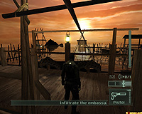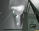 それを可能にするお楽しみのサムのアクションだが,今回は若干変更されている。まず,どこに飛んでいくか分からない二段ジャンプができなくなり,その代わりハーフスプリットジャンプからもう一回ジャンプして,より高い場所に飛びつけるようになった。また,パイプにしがみついた状態から武器を選択すると,逆さにぶら下がった状態になって銃を撃つ。ただ,パイプ移動に関してはキーアサインが変更されているので,前作のつもりで操作すると,サム墜落。ぺっちゃんこ。なんてことも起きるから要注意。