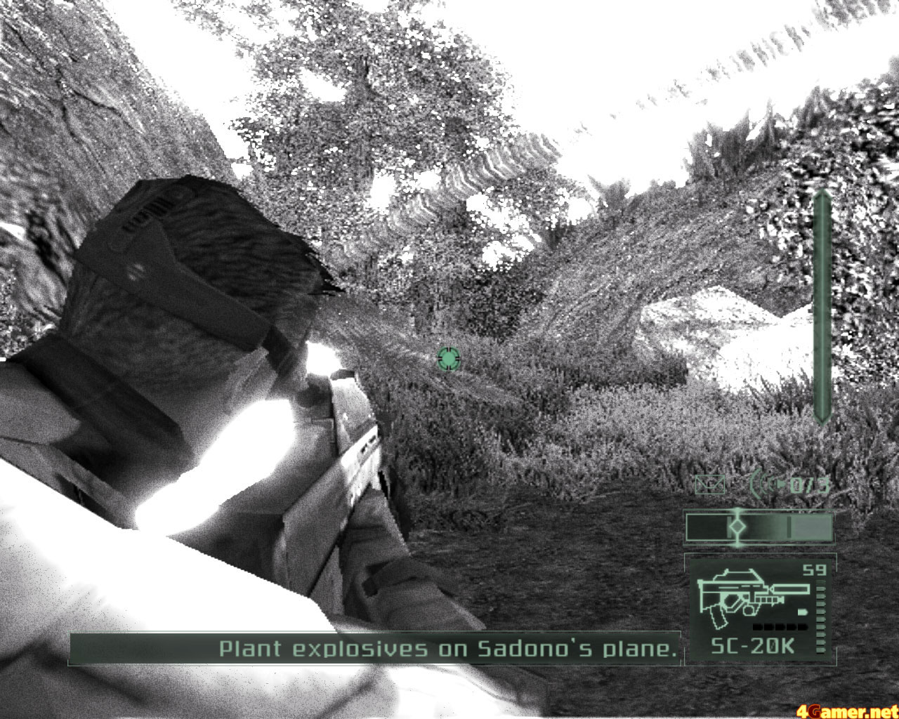 評判のグラフィックスにはさらに磨きがかかっており,今回の売りである野外シーンのディテールはすごい。ジャングルの鬱蒼とした質感や,草むらをサムがかき分けて歩き,それにつれて草がなびいていく様子などというのは,ほかのゲームではなかなか見られない。前作同様,自分の影が自分に落ちるセルフシャドウ,光源の移動で影がダイナミックに変化するところなど,いま市場にある最新のFPSでも実現されていないテクニックが,惜しみなく投入されている。また,ゲーム中の8割はこの画面を見て過ごすことになるであろうナイドビジョンは,前作に比べザラメ感が増し,やや見にくくなった。とくに,ジャングルなどの複雑なオブジェクトの前に距離をおいて敵が立つと,背景にまぎれて視認しづらい。さらに,明るい光源を見るとゴーグルが対応し切れず,画面がしばらく真っ白になるというエフェクトが加えられた。サムの命に関わるほど面倒ではあるが,リアル感は抜群だ。