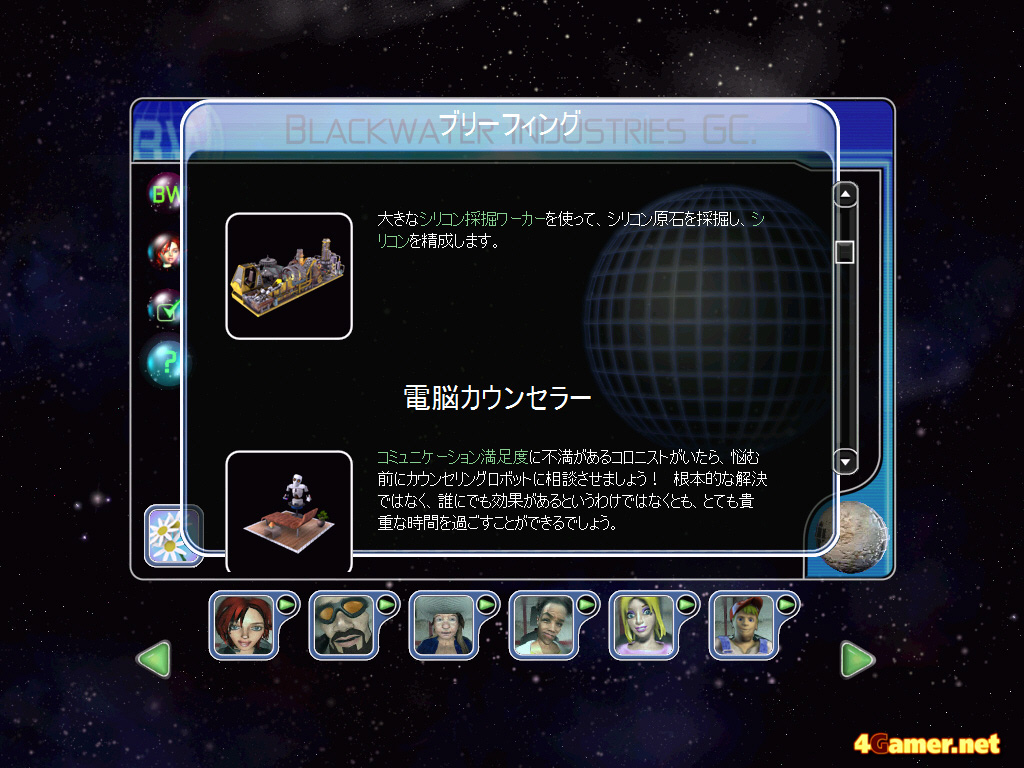 スペースコロニーキャンペーンとギャラクシーモードには「コロニー内の環境を向上させよ」「特定のコロニスト達を親友にせよ」「精密電子部品を作り販売せよ」など,数多くのシナリオが用意されている。ただしゲームオーバーになる条件はどのシナリオもほぼ同じで,"制限時間を超える"