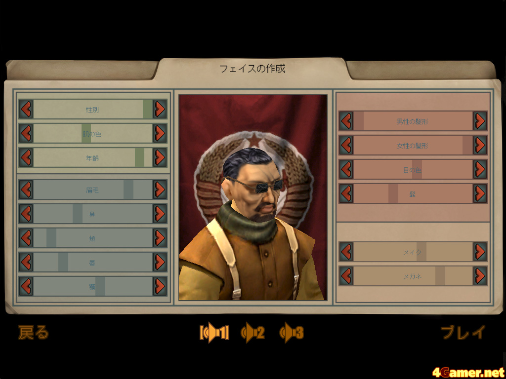 | 隊員構成は自由だが,チームメンバーは最大6人なので,大抵は6兵種で部隊を作ることに | 顔作成画面。"性別"というスライダーが面白い。右に寄せれば男性的に,左だと女性的に |