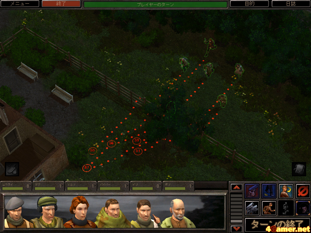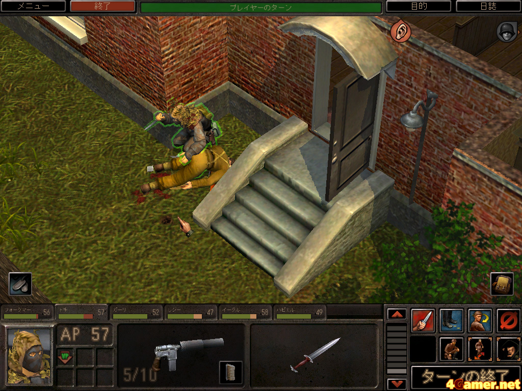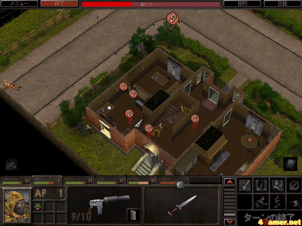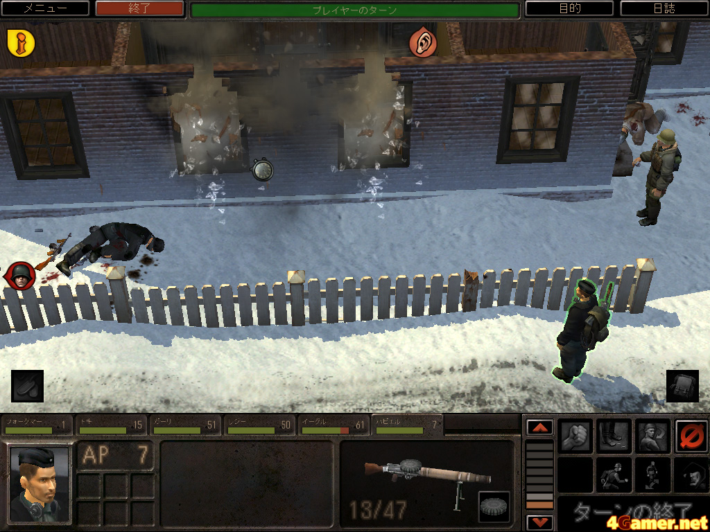 | 敵の頭部を狙う。部位を指定すると命中率が下がるので,より多くのAPを消費してじっくり狙いたい | 武器の種類はかなり豊富。威力や扱いやすさ,消費APが違うほか,それぞれ使用可能な弾薬も異なる | 物陰で敵の接近を待ち,ナイフで仕留めたところ。完全に身を隠すのは難しいので,キマると快感 |