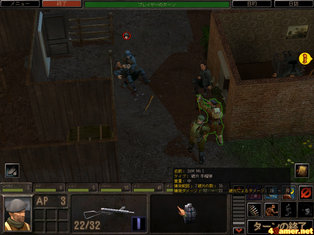 「こちらの"兵士"のダメージも大きいが,残った敵はあと二人。そこで"走行"して敵との距離を一気につめて命中率を上げ,両方に"狙いを定めた射撃"をお見舞いする。撃ちもらしがあった場合は,背後に控えている"偵察兵"と"手榴弾兵"の"慎重な射撃"でとどめを刺す」