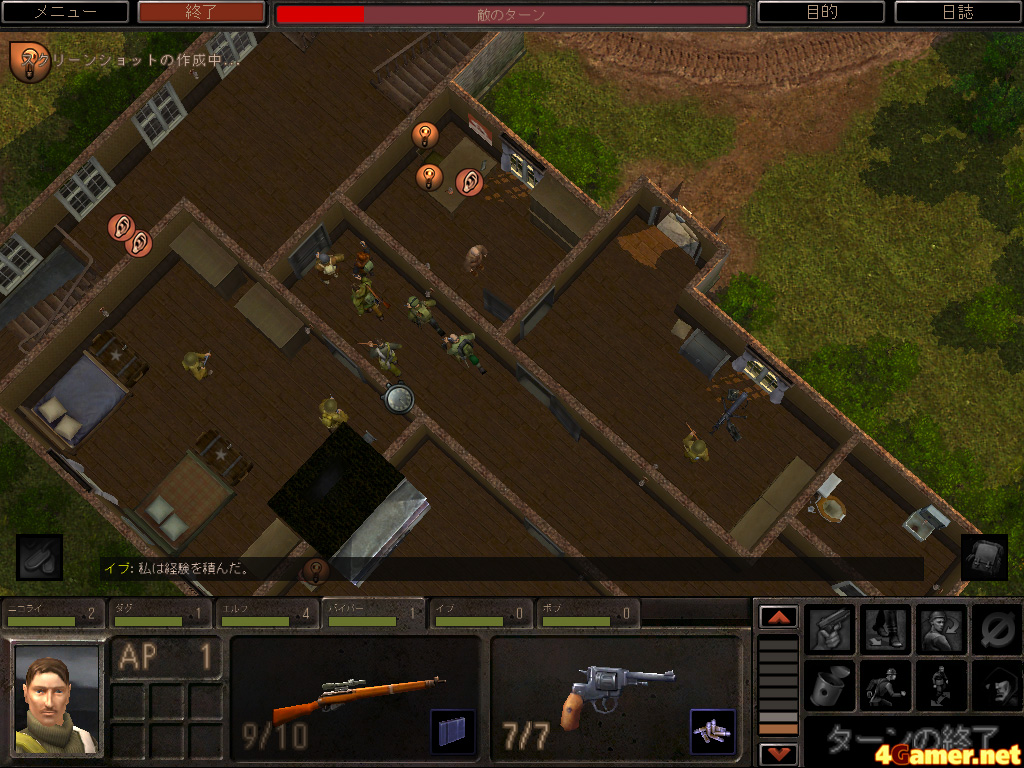 「どうしても倒したい敵がいるので危険を承知で"狙撃兵"をその場に待機させ,そのターンに使える"すべてのAPを使用"して敵兵の"頭に狙いを定める"。そして次のターンに命中率が90%にまで高まったヘッドショットを"慎重な射撃"で放つ」
