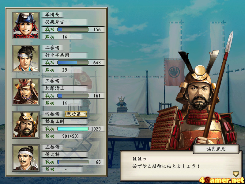 勝利条件は,敵軍団長を壊滅させるか,退却させること。敵軍団長にとどめを刺すと多くの"戦功"が稼げ,武士勲功獲得につながる。下っ端のうちは,できるだけ主人公がとどめを刺せるよう立ち回ろう。