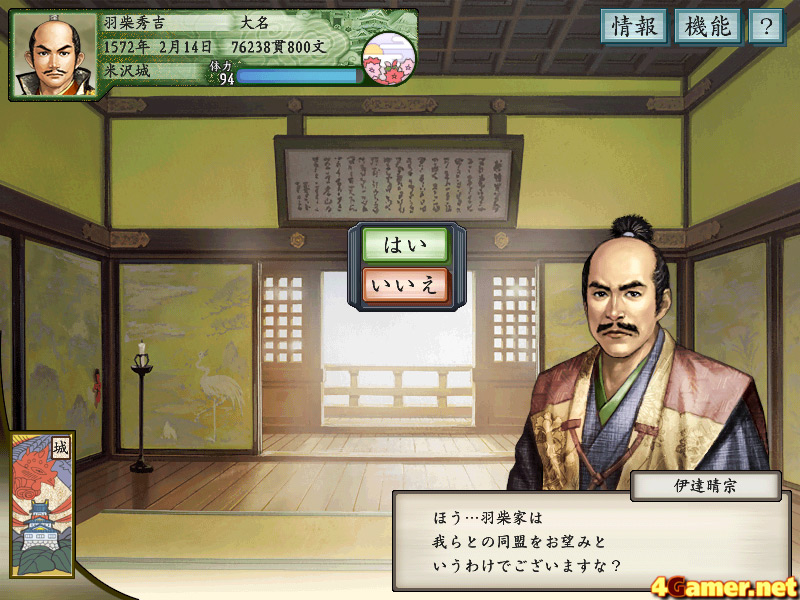 面白いのは,攻城戦中の相手との"交渉"がシステム化されていること。交渉内容は状況によって変わり,攻撃側が交渉できるのは,最大で"城将切腹"