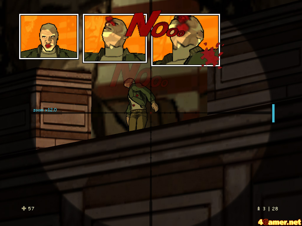 このNPR表現に加え,XIII独自の演出として異彩を放っているのが「コマ割りカットイン」演出。敵をド派手に倒したときに,その「やられ模様」を漫画のコマのようにダダダっという効果音と共に画面に表示してくれるのだ。具体的には,額ど真ん中に投げたナイフが命中したとき,スナイパーライフルで狙撃に成功したとき,高台の上の敵を倒して転落させたときなどにこの演出を見られる。