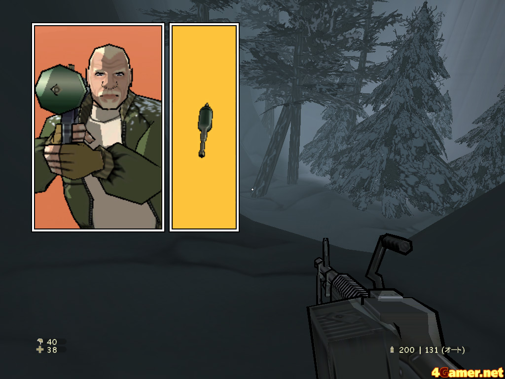 | スナイパーライフルではるか遠方の敵を狙撃。頭部に命中すればやられモーションがコマ割りカットイン! ちなみにこの映像は,リアルタイム生成されたものだ | 遠方で同時進行するイベントは,コマ割りカットインで見られる | 敵がロケット推進弾(RPG)を取り出してきた! 敵側が切り札を持ち出してきたときもコマ割りカットイン | |
