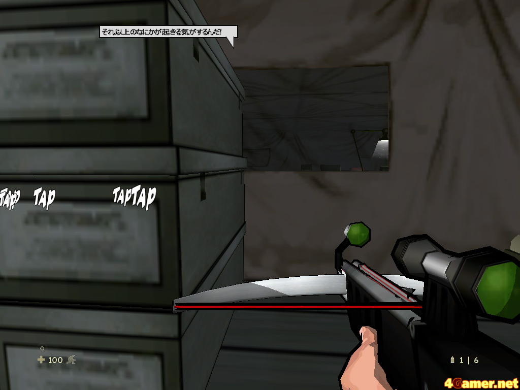 さてさて,これまた偶然か計算か,XIIIではゲーム中,敵に自分の存在を悟られてはならないシーンもあり,そうしたミッションでは,この描き文字が意外に重宝するのである。描き文字は,遠くの効果音は小さく,近くの効果音は大きく描かれる。つまり,敵がこちらへやってくる様子,あるいは去っていく様子などを,画面に描かれる足音描き文字で壁越しに判断できるのだ。