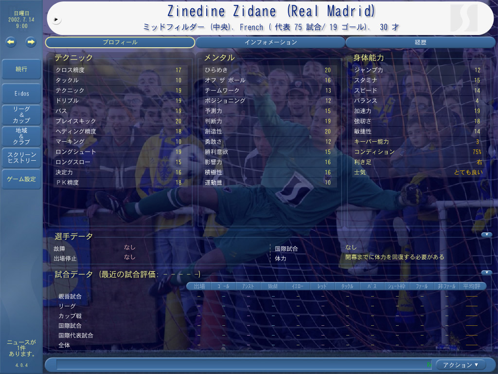サッカーチームの監督となって,世界一のクラブチームを目指すシミュレーションゲーム。プレイヤーは人材管理から資金運営まで,サッカーチームに関するさまざまなことをマネージメントする。本作の特徴は,そのデータの膨大さ。世界39か国の88リーグ,トータル20万人にも及ぶ実在選手のデータが登録されている。 |