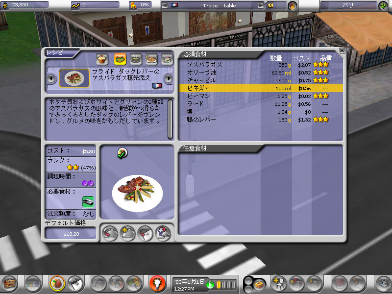 パリ,ローマ,ロサンゼルスの3か所のレストラン経営者となり,一流のレストランを目指す経営シミュレーション。経営者たるもの,店内の内装からメニューの内容/価格に至るまで,すべてをこなさなければならない。なお,レシピはイタリア,フレンチ,アメリカンに分類された180種類以上が登場。 |