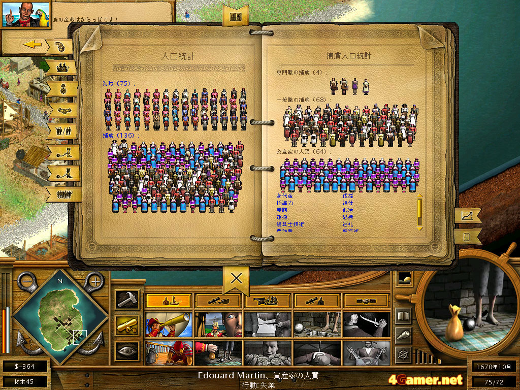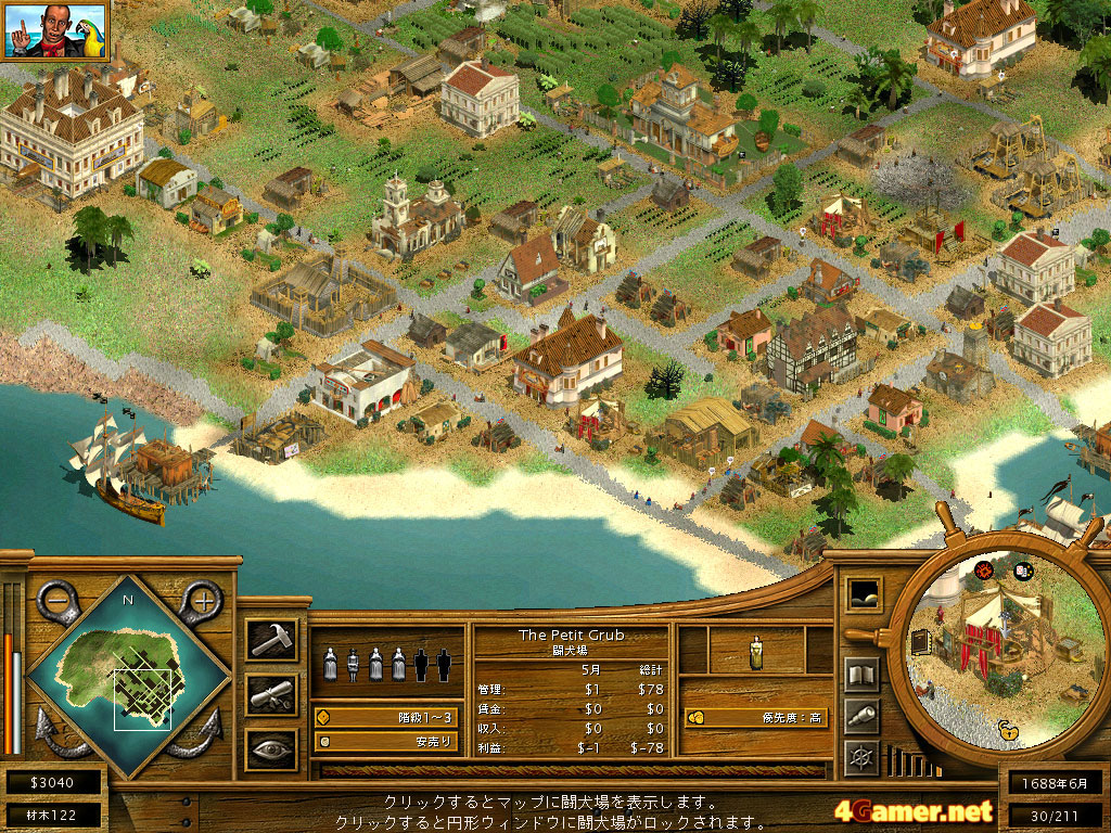 カリブの海賊王となって,とある南の島の開発を行う経営シミュレーションゲーム。30種類以上ものパラメータを持つ手下や捕虜に施設を建造させたり,略奪に向かわさせたりと指示を与えて,島の発展を目指す。仕事ばかりでは手下も不機嫌になるので,娯楽施設や食事/休息の用意なども忘れてはならない。最終目的はカリブの覇者だ! |