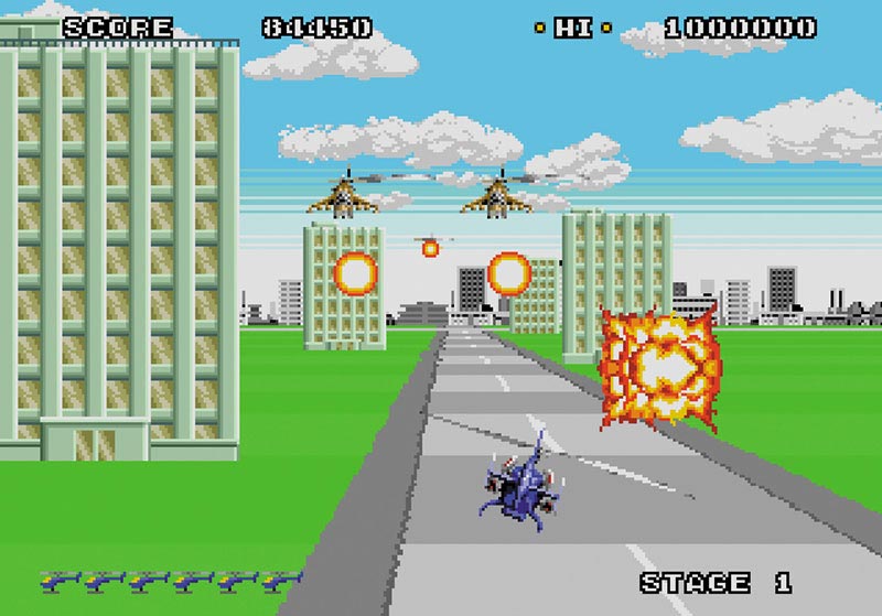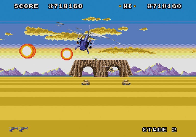 戦闘ヘリコプターを操作して,敵機などを撃ち落とすシューティングゲーム。敵の指令機との戦いは2Dで,襲い掛かってくる敵ヘリとの戦闘シーンは3Dで表示されるのが特徴的。 |