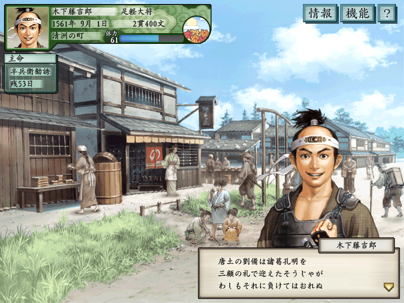 戦国時代の立身出世ストーリーを体験する,太閤立志伝シリーズ最新作。プレイヤーはのちの豊臣秀吉となる木下籐吉郎を始めとした,服部半蔵,柳生宗厳,九鬼嘉隆,納屋助左衛門の中から一人を選び,戦国時代を舞台にそれぞれの職業で天下一になるまでをプレイする。また,ゲームが進むにつれて選択できる人物も増えていき,最終的には約800人もの人物を選択可能。