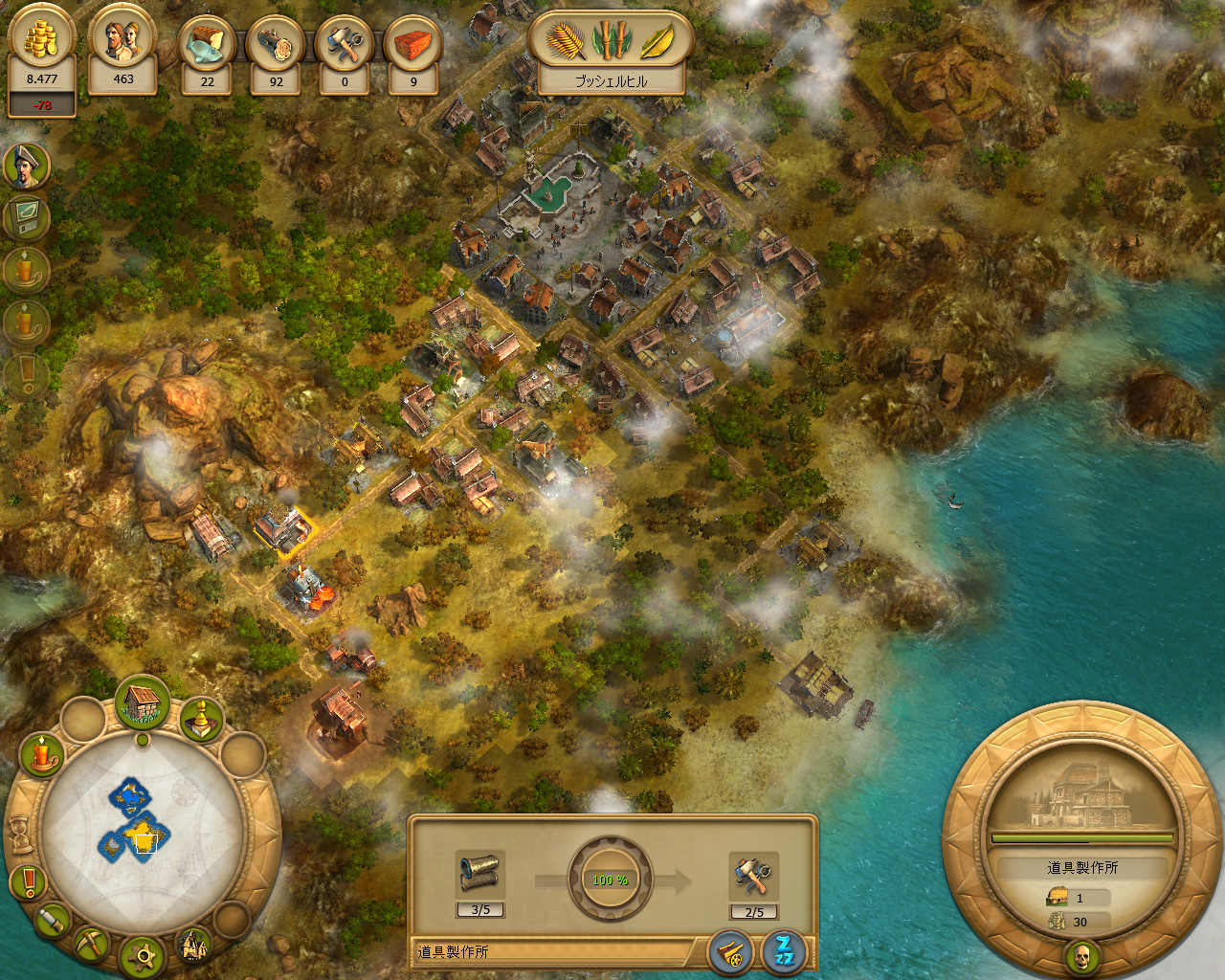 なお,道具を自己生産できるようになるためには,領土内に鉄鉱の鉱山,鉄鉱精錬工場,道具工場が必要となる。これらを設置するには(その他の必要条件をすべて満たしているとして)最低でも9トンの道具を確保しておかなければならない。
