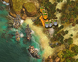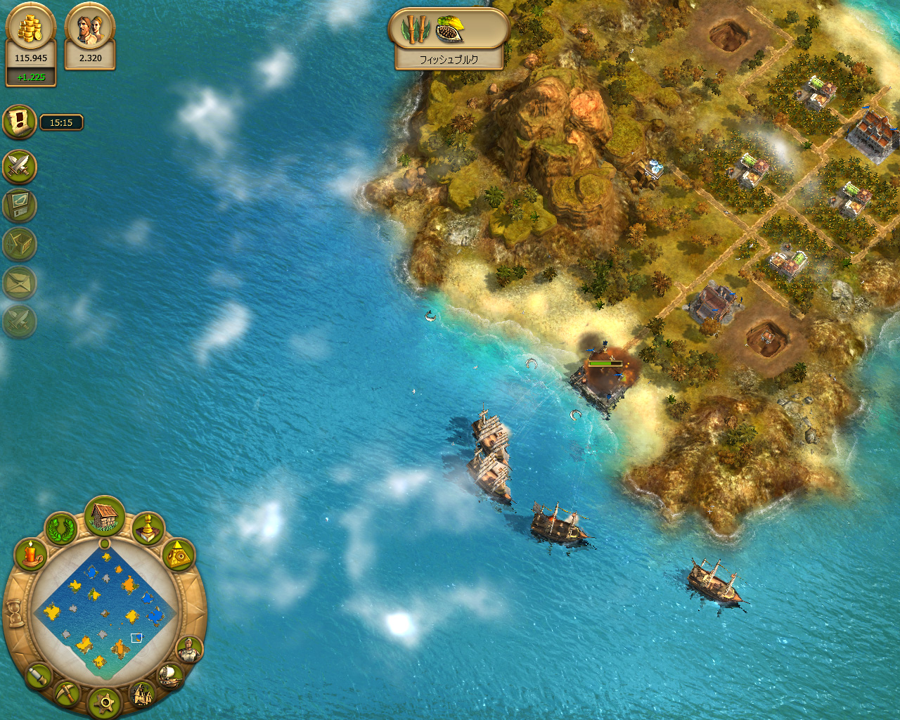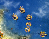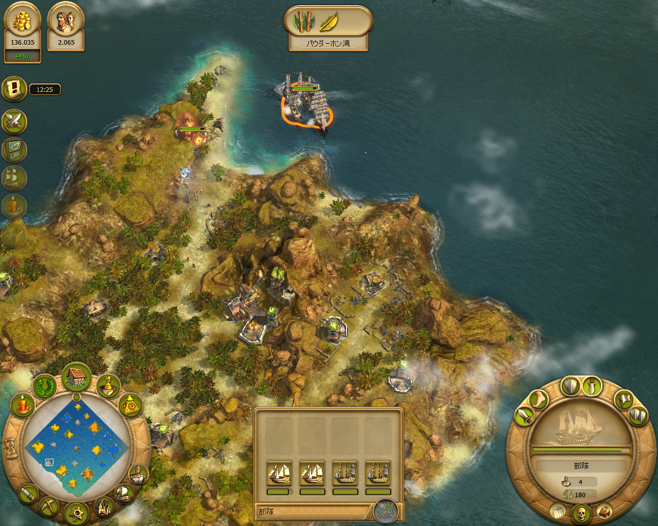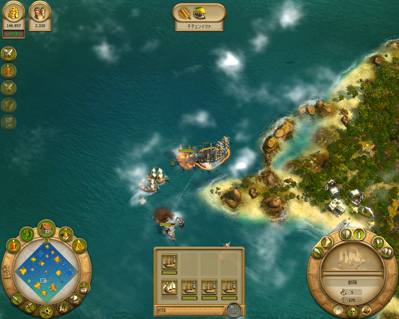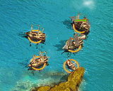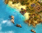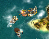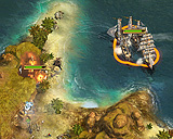 また,しばしばプレイヤーの交易船などを攻撃してくる厄介な海賊だが,こちらも根絶やしにするのは相当に困難だ。海賊の島で周囲の防護を固める塔なら戦艦で攻撃可能だが,中心部の「海賊の砦」は,兵を上陸させて攻撃するしかない。さらに砦からは,倒しても倒しててもひっきりなしに敵兵が現れるため,攻め落とすためにはプレイヤー側も人海戦を覚悟しなければならない。
