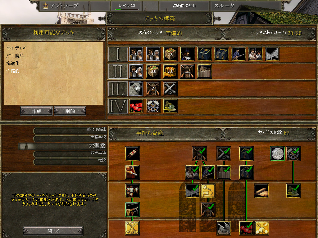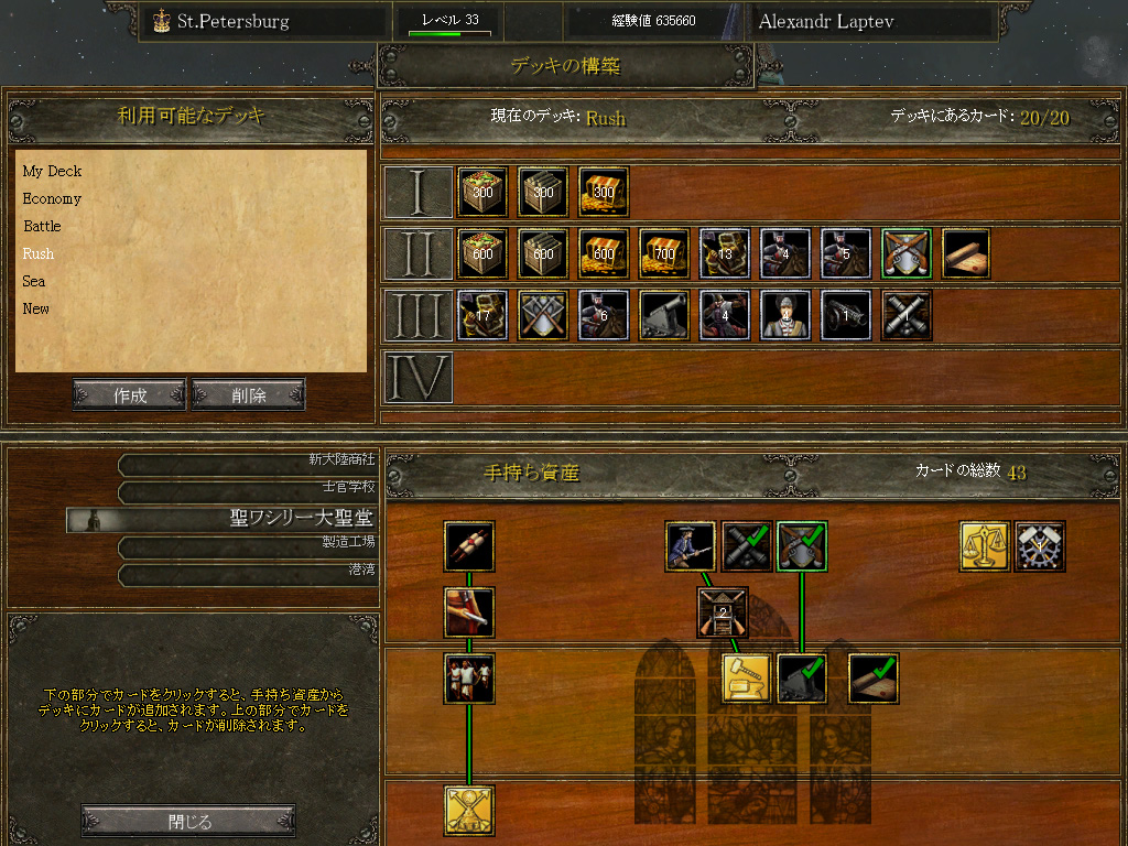 Rush戦略を採るときは,ホームシティのデッキは資源や軍隊のカードを中心に編成しよう。とくに軍隊を呼ぶカードを多めに組み入れておきたい。AoE3では戦闘を行うことで経験値が溜まって次のカードを使えるようになるため,うまく攻め続けることができれば,矢継ぎ早にカードを使って軍隊を次々と投入し,早い時間で勝利できる。
