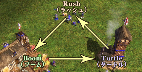 この3戦略は,とくにAoE3特有の概念というわけではなく,ほかの多くのRTSにも当てはまるものである。誰が考案したのかは定かではないが,AoEシリーズから生まれた戦略ということは確かなようだ。以下では三つの戦略について,それぞれ解説しよう。