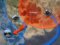 ¡¡Ortego¤«¤éÆî¤Ø¸þ¤«¤¦SLA¤ÎÁõ¹ÃÉôÂâ¤ËÂФ¹¤ë¡¤Â絬ÌϤÊÂÔ¤ÁÉú¤»¹¶·â¤ò½àÈ÷Ãæ¤Ç¤¢¤ë¡£Dolores»Ô¤Ë¤¢¤ë¶¶¤Î¿¤¯¤Ï¡¤¥µ¡¼¥é¥ËÅçÆîÉô¤Î¤¹¤Ù¤Æ¤Î´´Àþƻϩ¤Ø¤È¤Ä¤Ê¤¬¤Ã¤Æ¤¤¤ë¡£¤½¤ì¤é¤Î¶¶¤òÇ˲õ¤¹¤ë¤³¤È¤ÏºÇÍ¥Àè»ö¹à¤Ç¤¢¤ë¤¬¡¤²æ¡¹¤Ï¤½¤ÎÇ˲õ³èư¤Î¤µ¤¤¤Ë¡¤SLA¤ÎÁõ¹ÃÉôÂâ¤ÎÂçÉôʬ¤òÇ˲õ¤¹¤ë¤³¤È¤ò·×²è¤·¤Æ¤¤¤ë¡£»Ô¤ÎÃæ¿´Éô¤Ï³¤¤«¤éÆó¤ÎÏӤΤ褦¤ËÀÆþ¤êÁȤó¤À¤è¤¦¤Ê¾ì½ê¤Ç¡¤¤Á¤ç¤¦¤ÉȾÅç¤Î¤è¤¦¤Ë¤Ê¤Ã¤Æ¤¤¤ë¡£¤Ä¤Þ¤ê»ÔÆâ»°¤Ä¤Î¶¶¤òÇ˲õ¤¹¤ë¤³¤È¤Ç¡¤¤¹¤Ù¤Æ¤ÎŨÉôÂâ¤ËË̤˸þ¤«¤¦°Ê³°¤ÎƨÁö·ÐÏ©¤ò¤Ê¤¯¤·¡¤Ãæ¿´ÃϤËÊĤ¸¹þ¤á¤ë¤³¤È¤Ë¤Ê¤ë¡£È¾Åç¤ÎÉÕ¤±º¬Éôʬ¤Ë¤¤¤ëÂè3¾®Ââ¤Ï¡¤»Ô³¹ÃϤ«¤éË̤ØÈ´¤±½Ð¤À¤½¤¦¤È¤¹¤ëŨÉôÂâ¤È¸òÀ魯¤ë¤¿¤á¤ÎËɱÒÀþ¤òÄ¥¤Ã¤Æ¤¤¤ë¡£Âè2¾®Ââ¤Î»Ä¤ê¤Ï¡¤ÅìÊýÌ̤«¤éÍè¤ëŨ¤ÎÁý±çÉôÂâ¤ò´ó¤»ÉÕ¤±¤Ê¤¤¤è¤¦¤Ë¤·¤Æ¤¯¤ì¤ë¤À¤í¤¦¡£