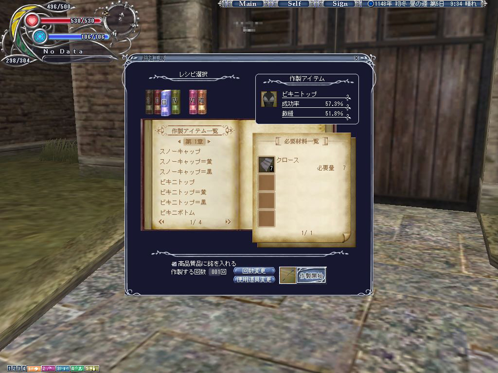 初期スキルに「裁縫」を設定しているため,Emmaはそこそこ縫い物が作れるはず。1秒でも早く「モテかわワンピ」に着替えるために,糸と針をしこたま購入して街中の「工房」へ向かわせたのだが。……スキル値30%では,まだまだロクなものが作れないし,成功率もかなり低い。多少は成果物をNPCに売り飛ばさなければ,次の針と糸を買う資金も尽きてしまうため,まずは低スキルでも成功しやすい「ビキニトップ」と「ビキニボトム」を作らせることにしてみた。つまるところブラとパンツである。