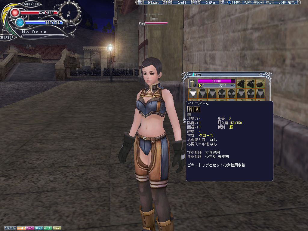 バッグの中に溜まっていく,大量のビキニ。素材もすっかり尽きたので工房モードから抜けてみると,なんと一歩も動けないではないか! ベルアイルでは所持可能な重量を超えると,まず走れなくなり,さらに荷重オーバーすると一歩もそこから動けなくなってしまうのだ。工房の中で生産活動している間は気づきにくいため,アイテムを作ってはみたものの,その場に捨てていくしかない……なんてこともマレに起こる。